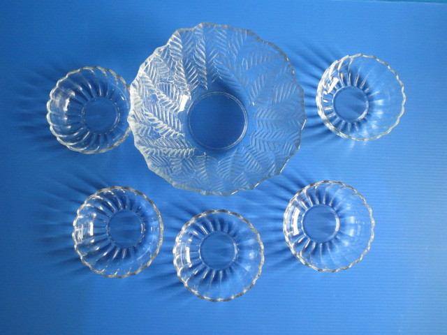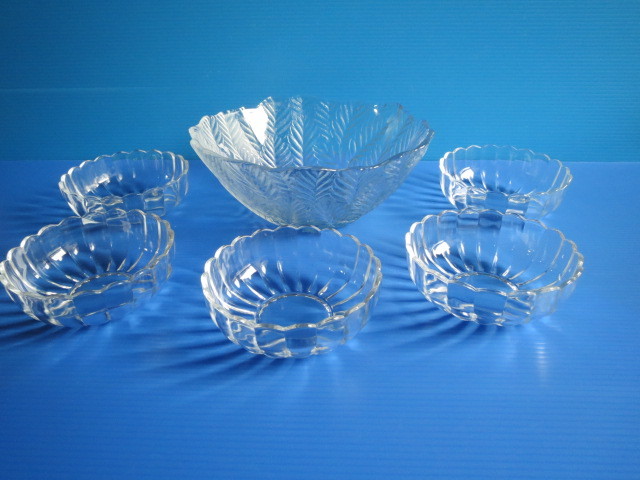中古、昭和レトロ「クリスタル・ボウル大1個・小5個」製作年不明、40年ほど前のものか?。写真で判断できる方の入札をお願いします。数回の使用はあると思われますが、日常的使用なく長期間サイドボードにしまってありました。「ボウル大」サイズ直径約24センチ、高さ9センチ。グラス厚み約5ミリ。重量1100グラム(ずっしりした重みのある製品です。)「ボウル小」サイズ直径約13センチ、高さ4.5センチ。グラス厚み約3ミリ。重量250グラム、箱なし●発送はゆうパック(770円~1400円、東京828円、発送先により異なります。)を予定しております。●自宅整理のため出品いたします。