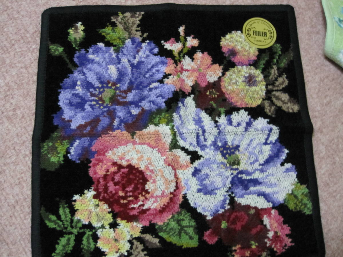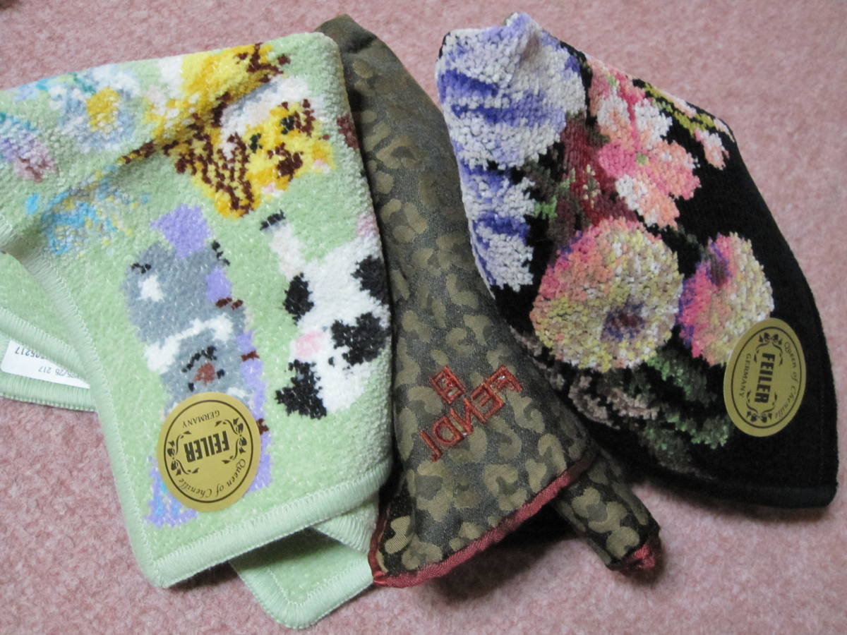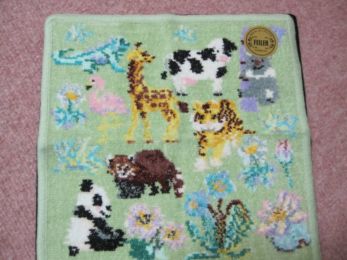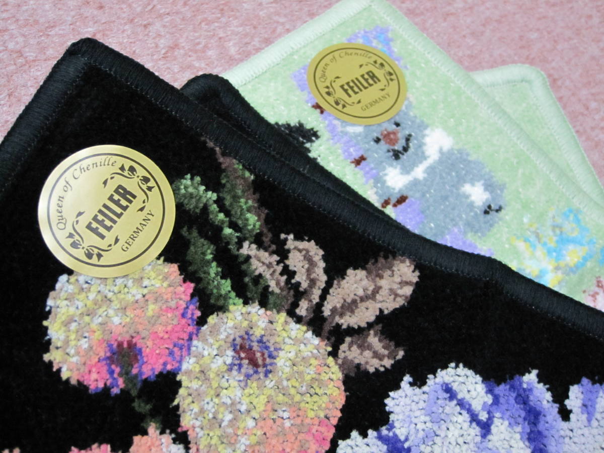 フェイラーのハンドタオル 黒地に花柄、うぐいす色に花、アニマル柄の25cmの正方形です。