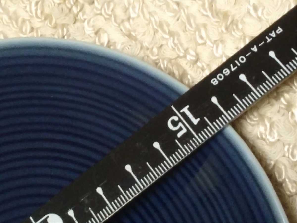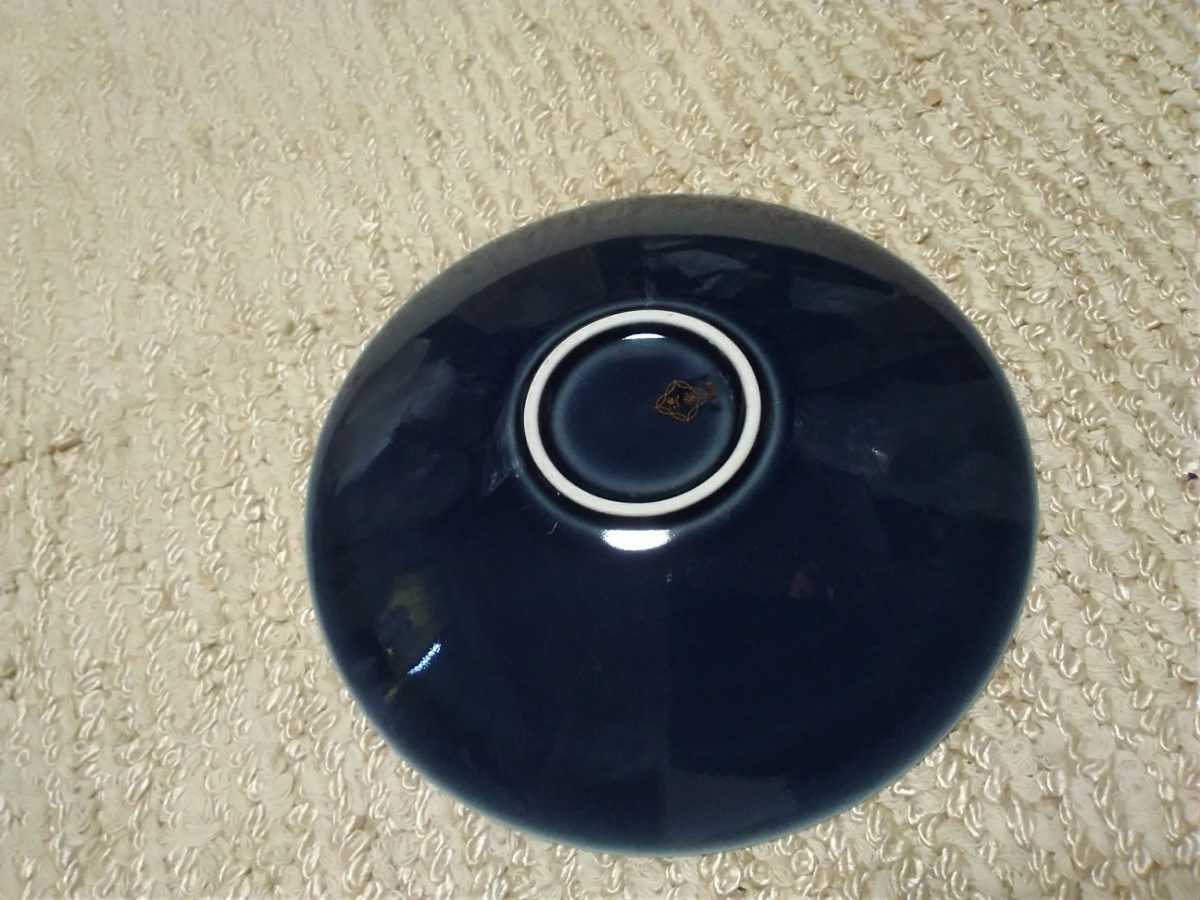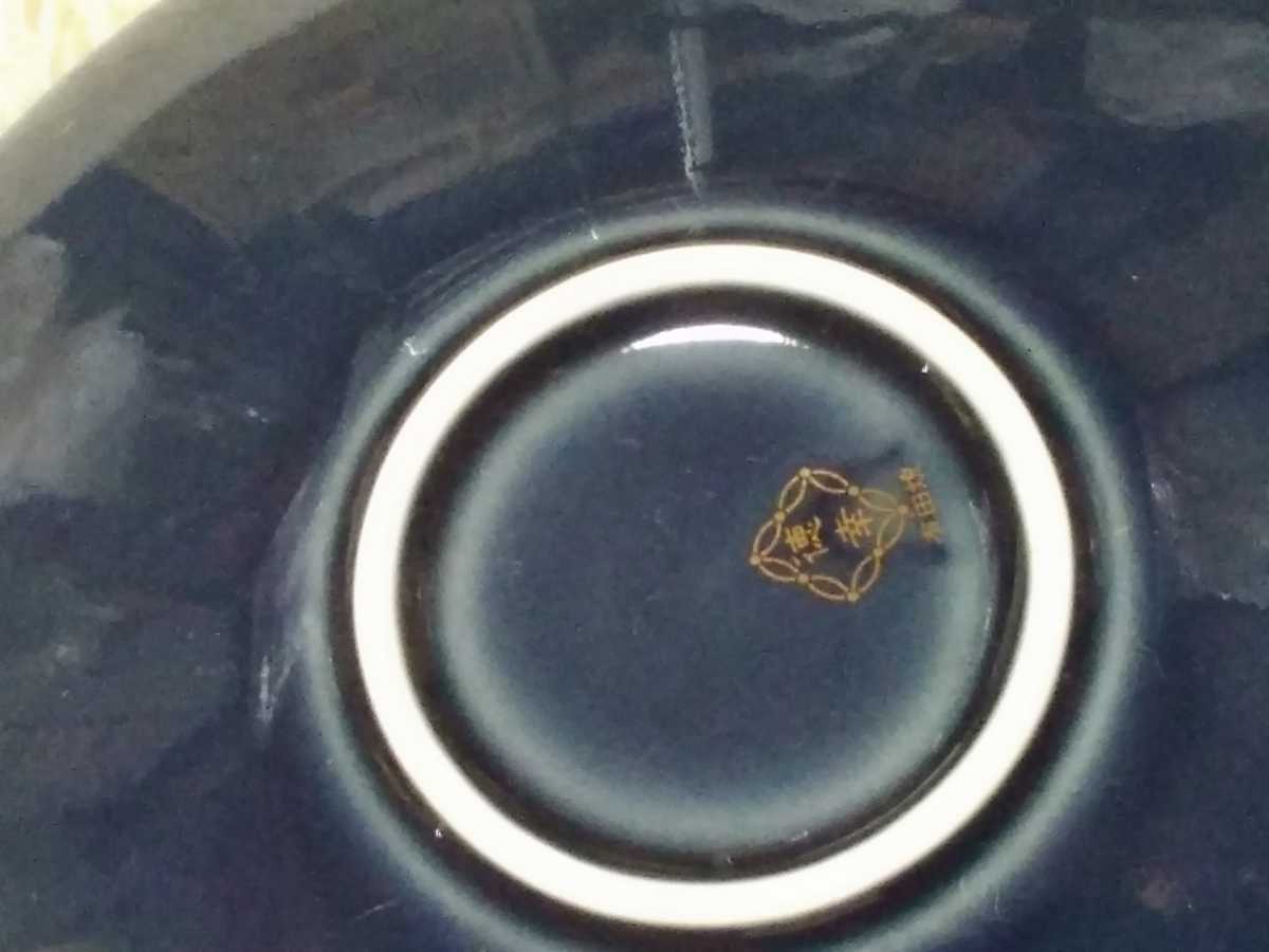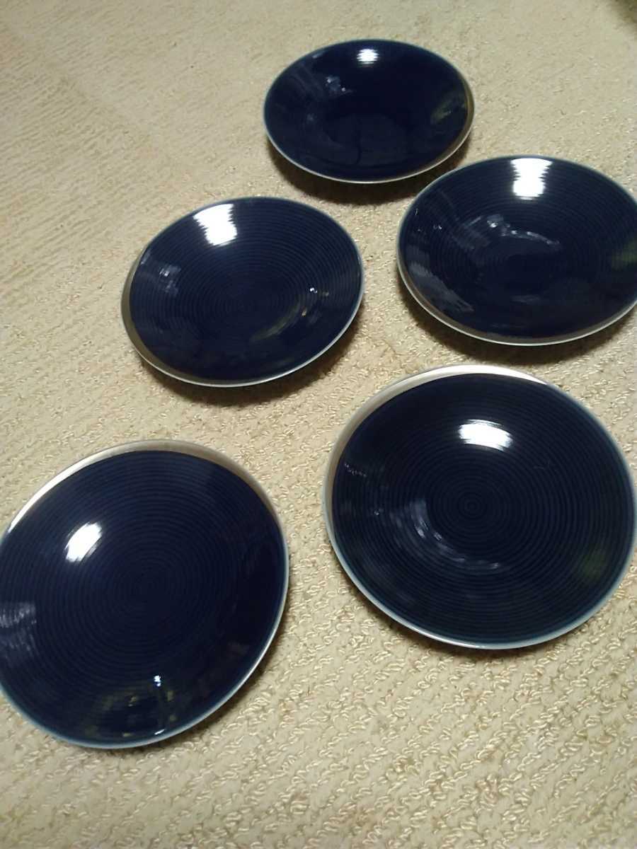 直径16 高さ3㎝ほどの紺の皿。未使用新品、手描きの渦、淵には銀色があります。