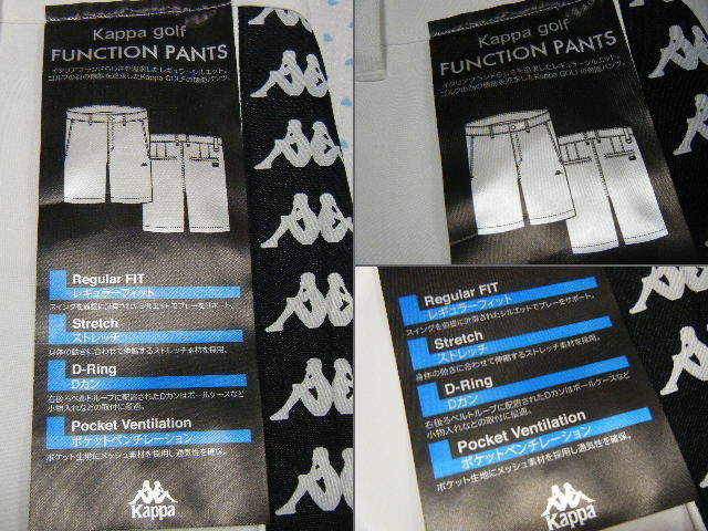 本体は軽量ポリエステル素材。  ソフトなツイル生地を使用し、吸水速乾+2WAYストレッチ性に優れた機能を持たせたゴルフ用高機能ショートパンツ・ハーフパンツ。       レギュラーパンツ。     両サイドに「バンダ/BANDA」 ライン。    ベルトループ装備。    2020年春夏モデル。    モデル名 KAPPA GOLF FUNCTION PANTS   カラー WH/白色