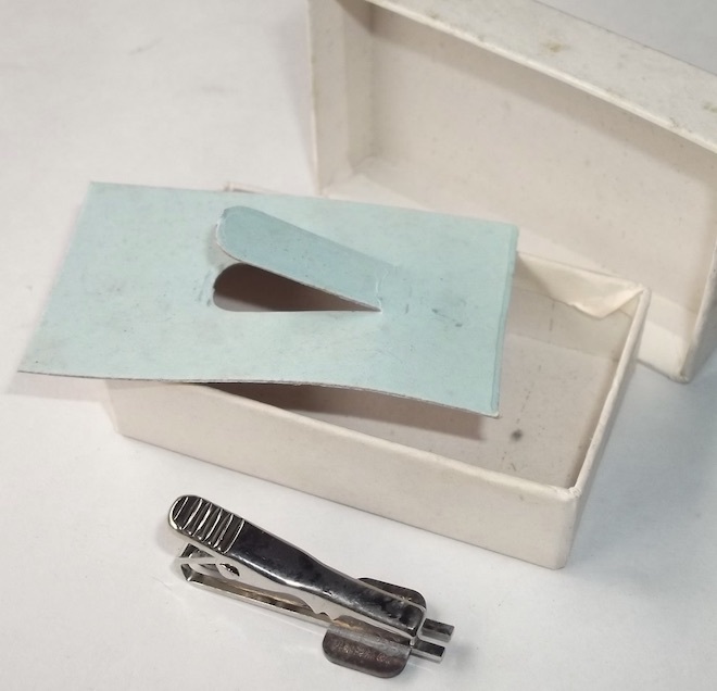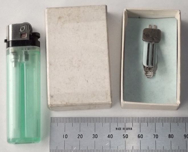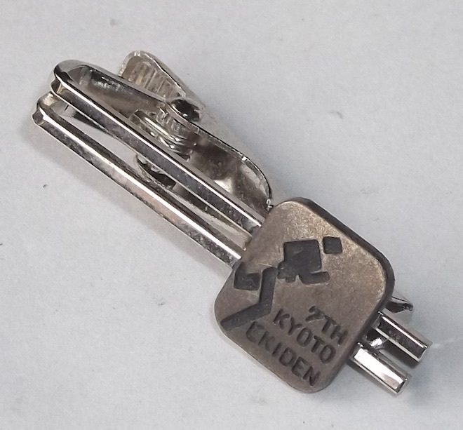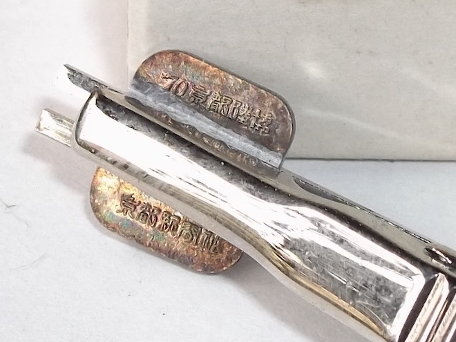 古くて小さなタイピンです。裏の刻字が小さすぎてはっきり読めませんでした、「'70 京都陸協 京都新聞社」のように見えるのですがもし読み間違えていたらすみません。時代物でよごれいたみ経年感強くみられます、大体の様子は画像参照ください。全体的にスレキズ・メッキのカスレくもり・経年の金属変色など劣化あり。収められていた紙箱は簡易なものでヤケいたみ時代ヨゴレ強いです。画像のメジャーやライター1円玉などは大きさ参考用です。他にも古書やアンティーク雑貨などをいくつか出品しております。