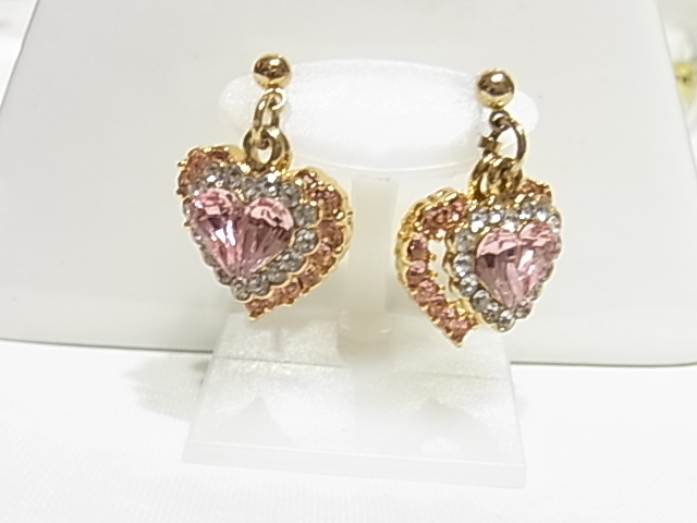 ピンクとクリアのラインストーンが輝くビジュー ハートが可愛いデザイン 2つのハート 耳元で揺れるキュートなピアス☆