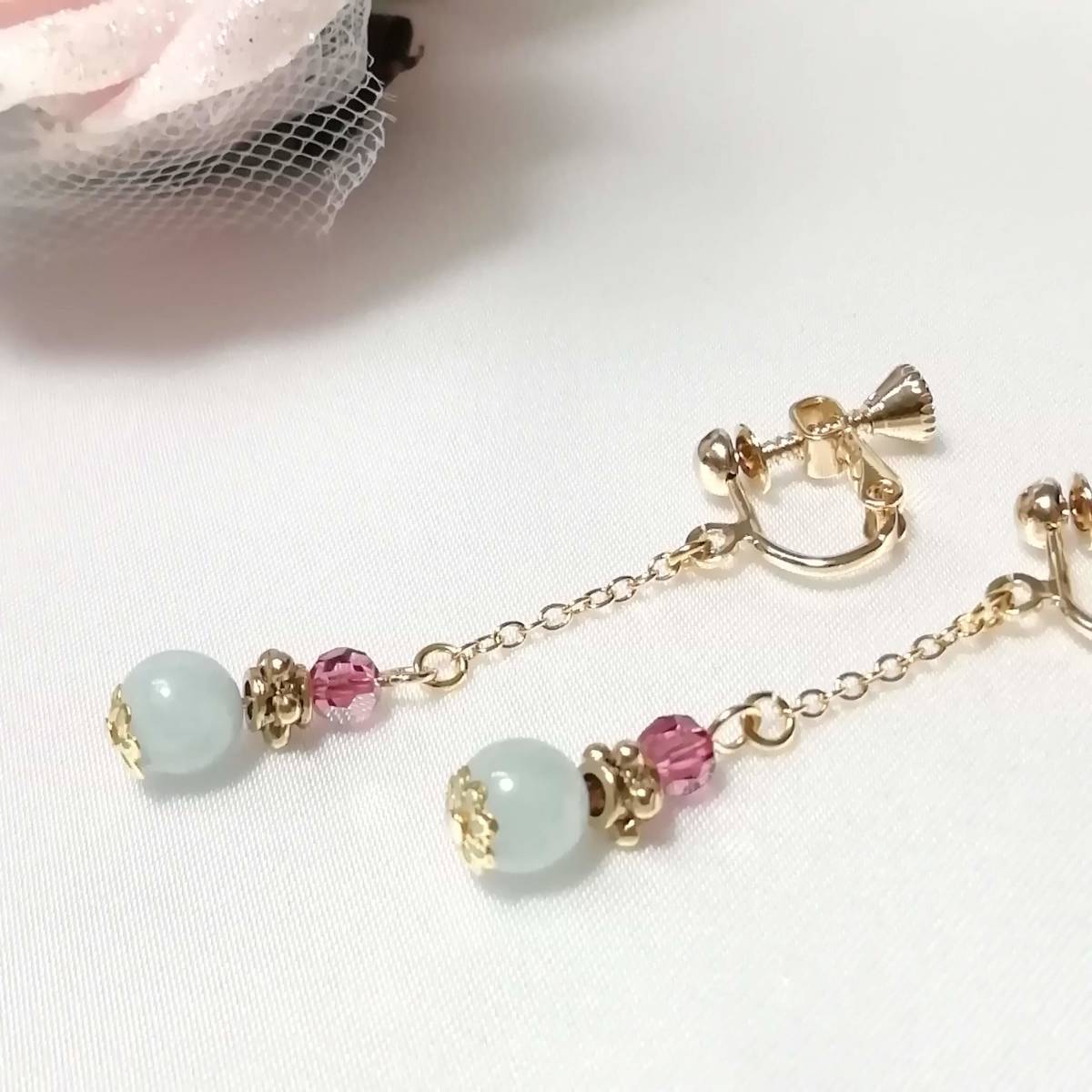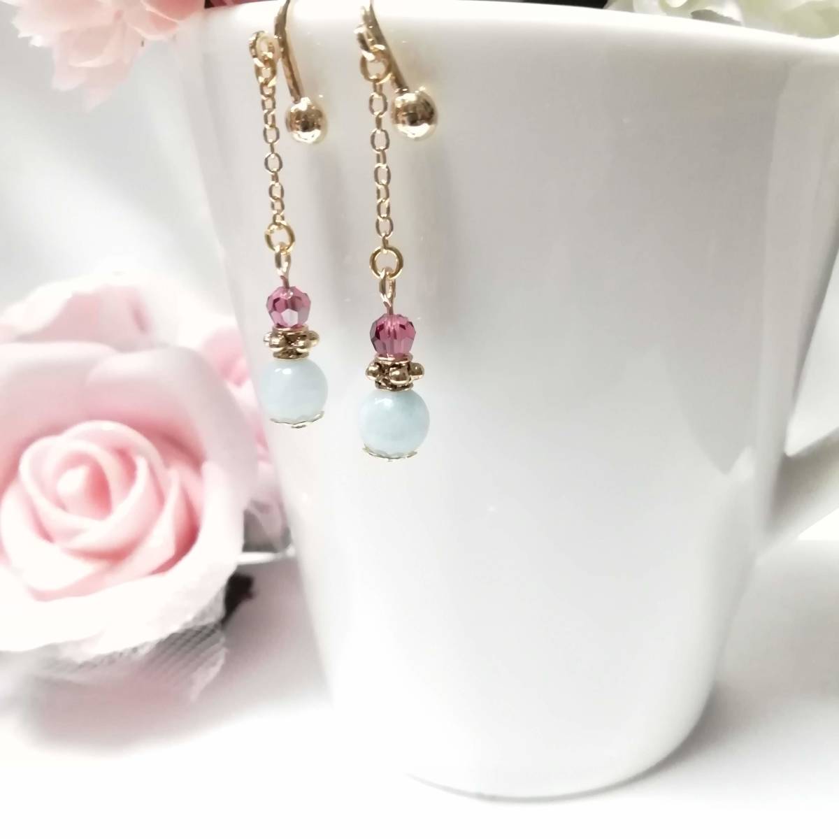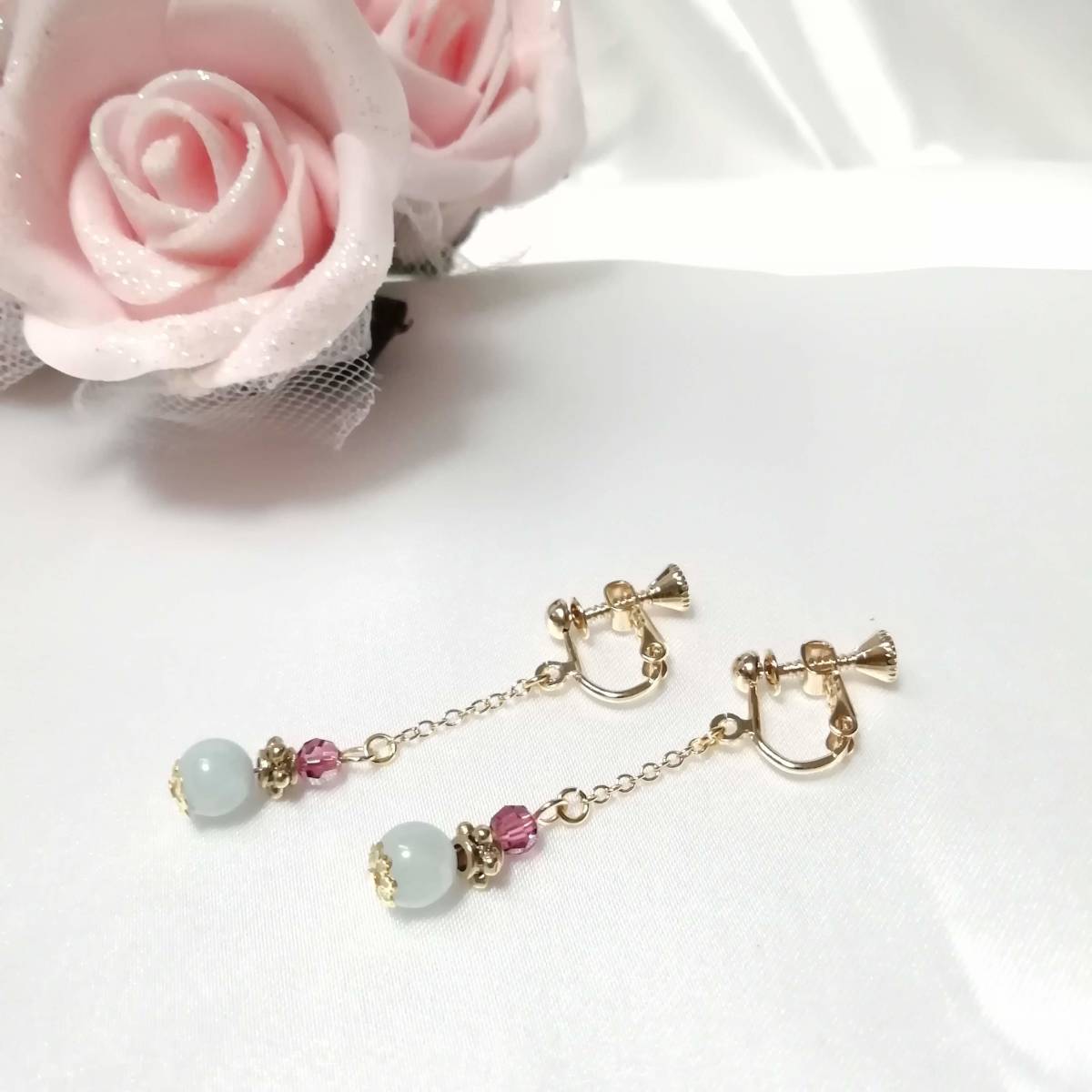 ★商品内容★ 天然石アクアマリンのハンドメイドイヤリング★天然石/アクアマリン/上品/水色/ゴールド/ローズピンク/短め/スワロフスキー/ダイヤカット 天然石アクアマリンの シンプルなイヤリングです。*・.**.・。**.・。*・**。・ ローズピンクとホワイトブルー、ゴールドの組み合わせが 個性的でスタイリッシュな大人の女性らしさを印象付ています*・.**.・。**.・。*・**。・ 普段使いはもちろん、 お洒落のワンポイントにも最適です。*・**.・。**.・。*・**。・. 【素材】 天然石アクアマリン6mm スワロフスキー5000ダイヤカットローズサテン4mm ピューター製スモールサタンリングゴールド 小粒チェーンゴールド 花座(菊華)ゴールド カンより垂れ下がる長さは、約3.5㎝です。 Eー798 ★注意事項★ ***~ご購入前に必ずお読み下さい~*** *・*・*落札後について*・*・* *落札後4日以内にお手続き、ご連絡が無い場合は落札者都合で削除致します。 *発送日指定・ご入金の予定が1週間以上先をお考えの方は、入札の前に質問よりご連絡くださいませ。 予めご了承の上、ノークレーム・ノーリターンでお願い致します。 *・*・*商品について*・*・* *一点一点心を込めて作っておりますが、手作りなため多少の歪み等あるかもしれません。 手作りの味わいと、世界で一つだけの作品とお考えいただければ幸いです。 *デリケートな商品ですので、強く引っ張ったりすると破損する事もあります。 お取り扱いにはご注意ください。 *ご覧のPC、スマホによっては画像と実物の色味が多少異なる場合があります。 *基本イヤリング金具は跳ね上げネジ付き金具にて作成しております。 **ご希望によりピアスへの変更も承っております。 【フックピアス…無料/キャッチピアス…別途追加料金120円】 *その他…樹脂ノンホールピアス(無料)・カン付き樹脂ノンホールピアス(別途追加料金20円)にも変更をお受け致します。 ~ご注文の際にメッセージ欄よりお申し付け下さい~ 尚、金具変更のご希望が無い場合は、掲載された写真の金具にてお送り致します。 *金属アレルギーや化学物質アレルギーなどへの対応はしておりませんので、ご心配な方はご遠慮下さいますようお願い致します。 *永くご愛用頂くために、ご使用後は柔らかい布等で軽く拭いてください。 *・*・*プレゼント用梱包のご要望もお受けいたします*・*・* *その際は、梱包費用が別途で必要となりますのでご注意ください。 また、ご希望の梱包タイプによって、発送方法が変わりますので、送料が別途必要となります。 プレゼント用梱包タイプ 【袋→100円】 発送方法【クリックポスト(送料無料)】 プレゼント用梱包タイプ 【箱→200円】 発送方法【レターパックプラス(別途520円)】 袋タイプは【合計100円の追加料金】、箱タイプは【合計720円の追加料金】となります。 ◆ご希望の場合は、必ず商品ページをウォッチリストに登録した上で落札前に質問にてお問合せ下さい。◆ ◆ご希望を承り次第、一度出品を取り消し、プレゼント用梱包費用、送料などを追加した金額へ変更し、再出品致します。◆ *再出品後に再度検索して頂く手間が省けますため、プレゼント梱包をご希望の場合は必ずウォッチリストへのご登録をお願い致します。 金額変更後の再出品から3日以内に落札されなかった場合、誠に勝手ながら購入する意思がないとみなしまして、元の金額へ修正致します。 また、修正後、再度プレゼント用梱包のご希望のお問い合わせを頂きましても、お断りをさせていただきますのでご注意ください。 ご不明な点がございましたら、落札前に質問よりお願い致します。 ***ご質問について*** *ご購入前にお願い致します。 日中は仕事をしておりますので、ご返事が直ぐに出来ない場合がございます。 出来る限り早い対応を心がけますが、ご了承ください。 また、発送までには、お振込み確認後、翌日の発送を心がけておりますが、仕事の都合により2~3日程かかる場合がございます。(その際にはナビにてご連絡いたします) お急ぎの場合は、極力対応いたしますが、場合によっては対応致しかねる事もあります。ご了承下さいませ。 | |||