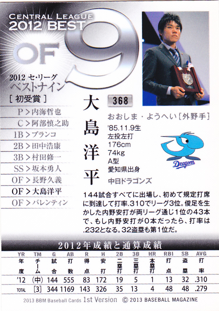 BBM2013ベースボールカード1st 368 大島洋平 愛知県 中日ドラゴンズ