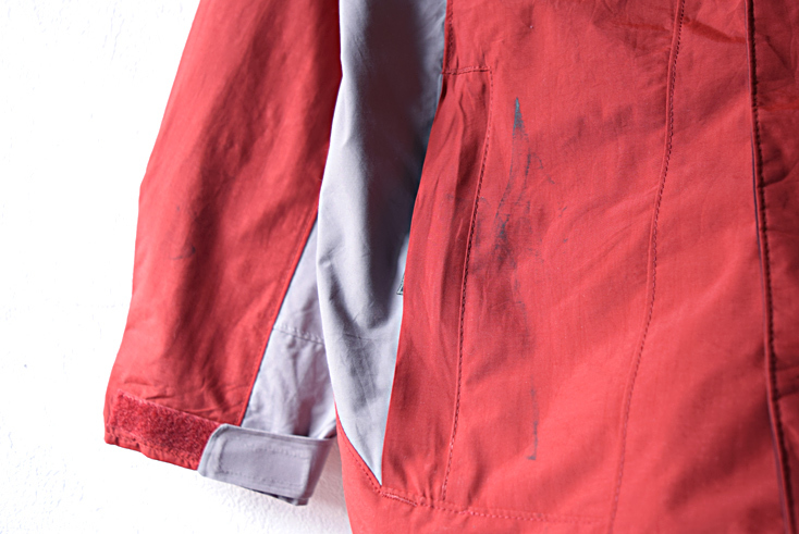 右袖・右ポケットの辺りに黒い汚れがあります。