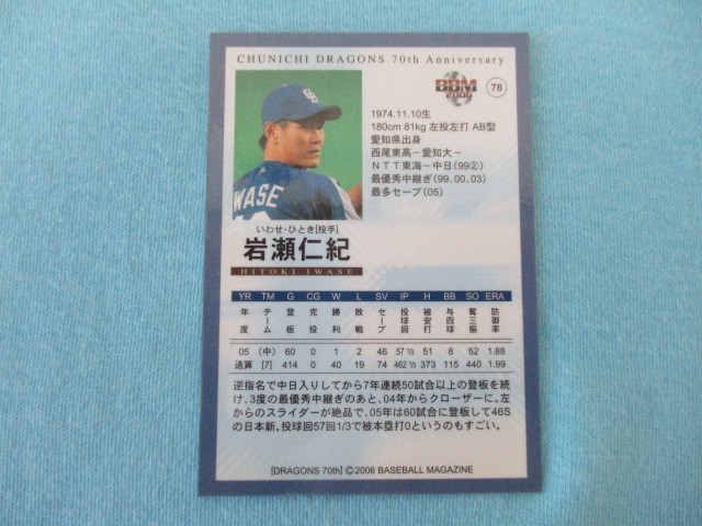 ★BBM 2006★〔78 岩瀬仁紀〕中日ドラゴンズ 70周年 記念カード トレカ♪
