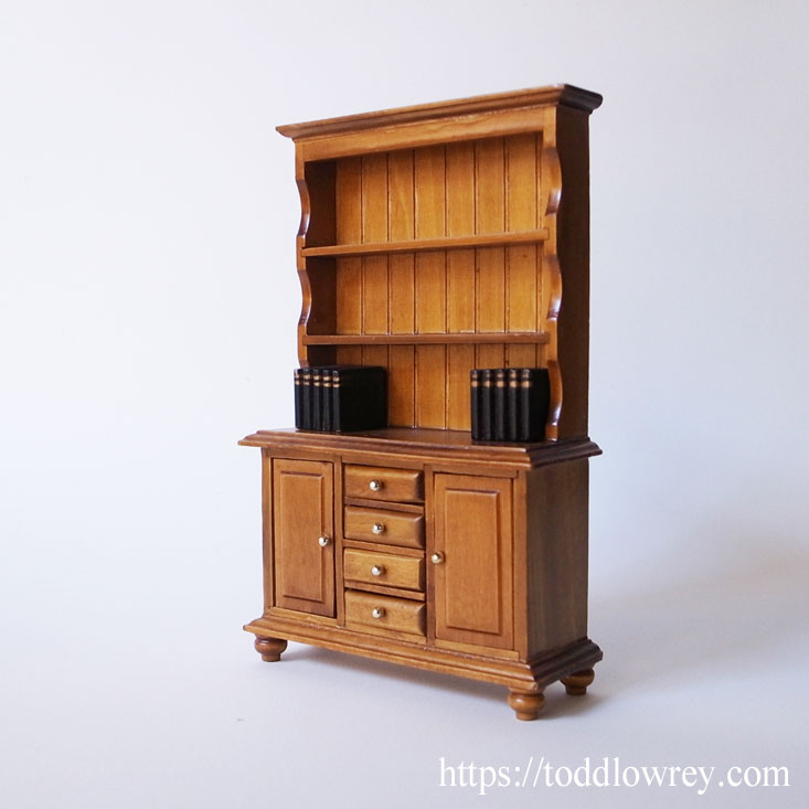 英国で一般的な家具で、日本人にとっては違和感があるであろう家具、カップボード。 カップボード/Cupboardとは食器棚のことで、文字通りティーカップを収納するための棚から発展したといわれています。 日本では食器棚といえばほとんどがガラス扉がついているもの。一方で英国でカップボードといえば、上部がオープンシェルフになっていて、そこにそのままカップやお皿を並べるのが一般的。 え、それじゃあ、ホコリがついちゃうじゃない? そう思われることでしょう。 ただ、英国にしばらく滞在したことがあるかたはこう思われるはずです。 英国ではホコリは積もらない。 いえ、皆無というわけではありませんが、本当に少ないのです。例えば東京では2-3日たてばリビングのテレビにはうっすらホコリがつきます。ただ、私が住んでいたロンドンの部屋では、テレビの掃除って・・・1年で何回しただろう?という感じでした。 (お察しの通り私はそれほどキレイ好きではありませんが、お客様をお招きできる程度には整えていた、と思います・・・。) カーペット敷きの部屋が多くホコリが舞い上がりにくいこと、湿度が低くホコリがまとまりづらいことなどが考えられますが、これには誰もが明確な答えを出していないかと思います。 ということで、ごく普通にオープンのカップボードに食器は並べられ、そのまま使う・・・という人が多いように思います。 さて、今回ご紹介するのは、そんな英国らしい家具、カップボードのミニチュアです。 上部収納は例によってオープンで、左右の側板には可愛らしくリズミカルな波型の刳り込みが入っています。 下部収納は左右に開き扉、中央に4棹の引き出しがついており、すべて開閉が可能。トップや天板、底板に廻されたモールディングや、挽物の脚など作りは本格的でまさに正統派カップボードといえるでしょう。 幅が約10cm、高さが約16cmですので、1/12スケールとすれば幅が120cm、高さが192cmとなります。英国のカップボードとしてはごく標準のサイズですので、1/12スケールのドールハウスにも違和感なく収めていただけるかと思います。本を模した2つの木製パーツが付属しているのも嬉しいポイント。(食器棚なのですが) ドールハウスに置いてみたり、ディスプレイとして楽しんだり。 下部収納に大切な小物を仕舞っておくのもおすすめです。 英国らしい小さな家具をお手元に置いて、各国のホコリ事情などについてぼんやり考えるのも一興かと思いますが、いかがでしょうか。 ◆England ◆推定製造年代:c.1960-70年代頃 ◆素材:木 ◆サイズ:幅約10.2cm 奥行き約3.8cm 高さ約16.2cm ◆重量:108g ◆在庫数:1点のみ 【NOTE】 *古いお品物ですので、一部に小傷や汚れ等がみられます。詳細は画像にてご確認ください。 *安定して自立します。 *画像の備品は付属しません。 *上記ご了承の上、お求めください。 |