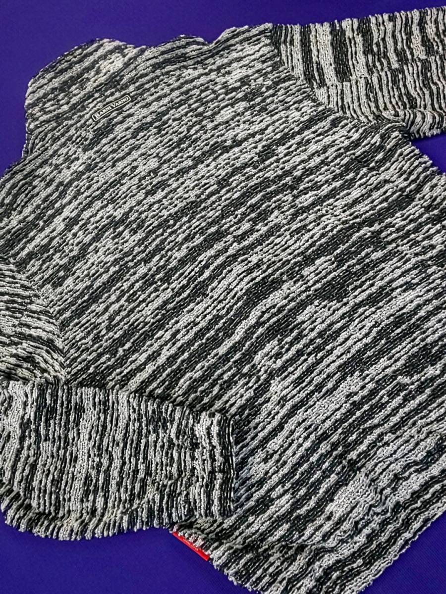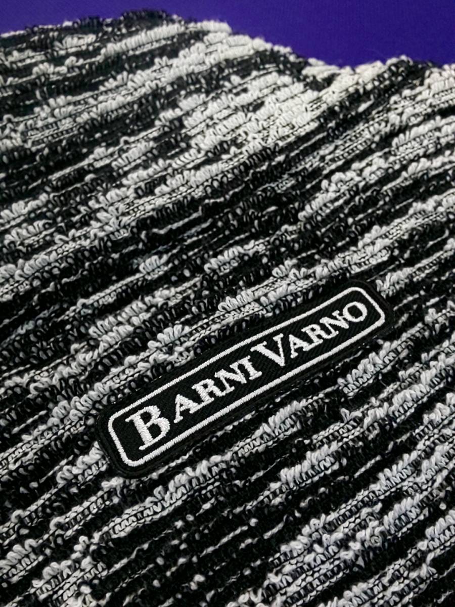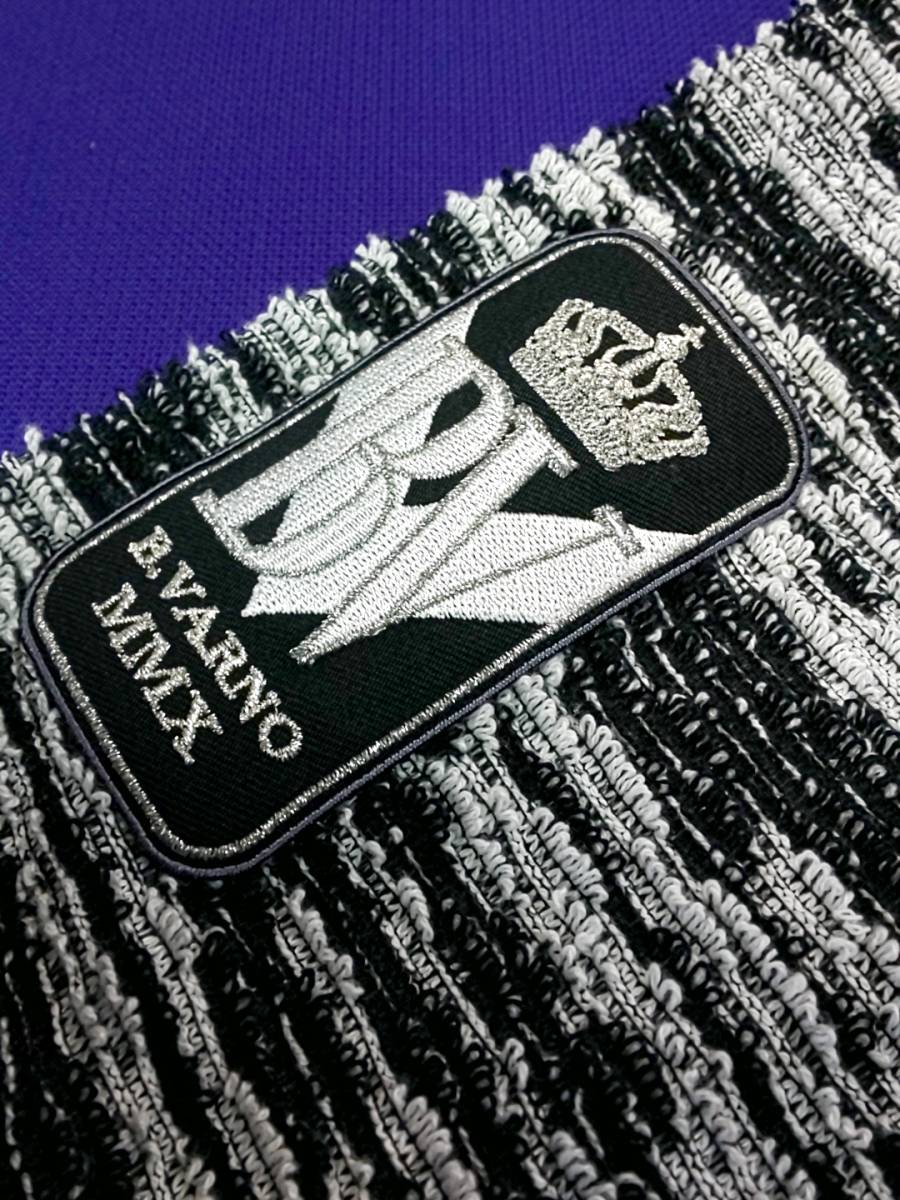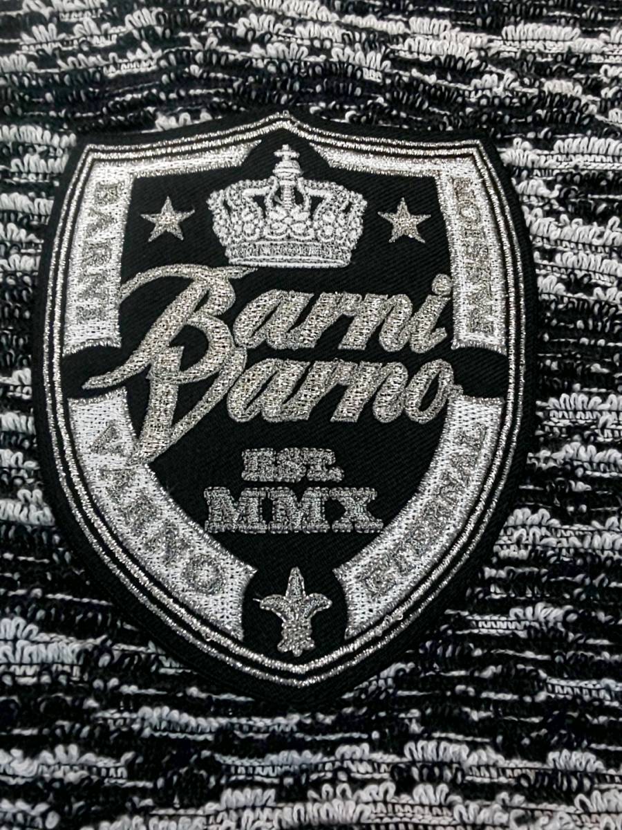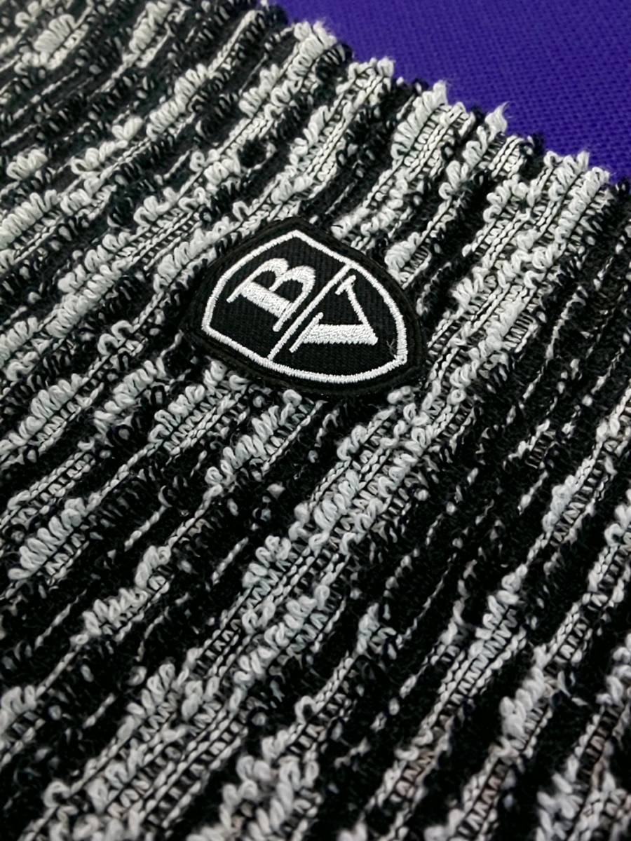 おうとつ感あるループのボーダー、胸、袖、背中、の刺繍エンブレムワッペンなど