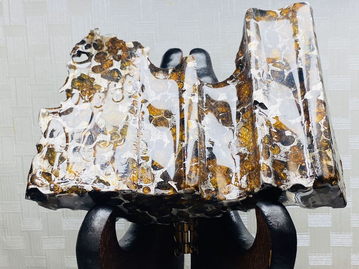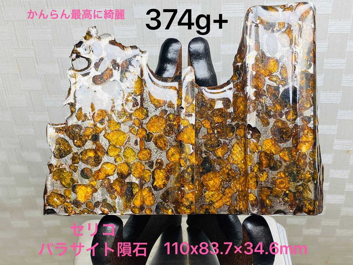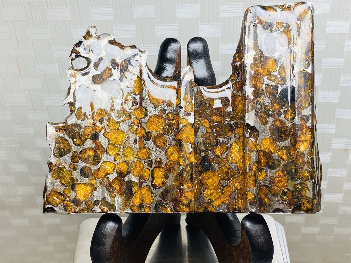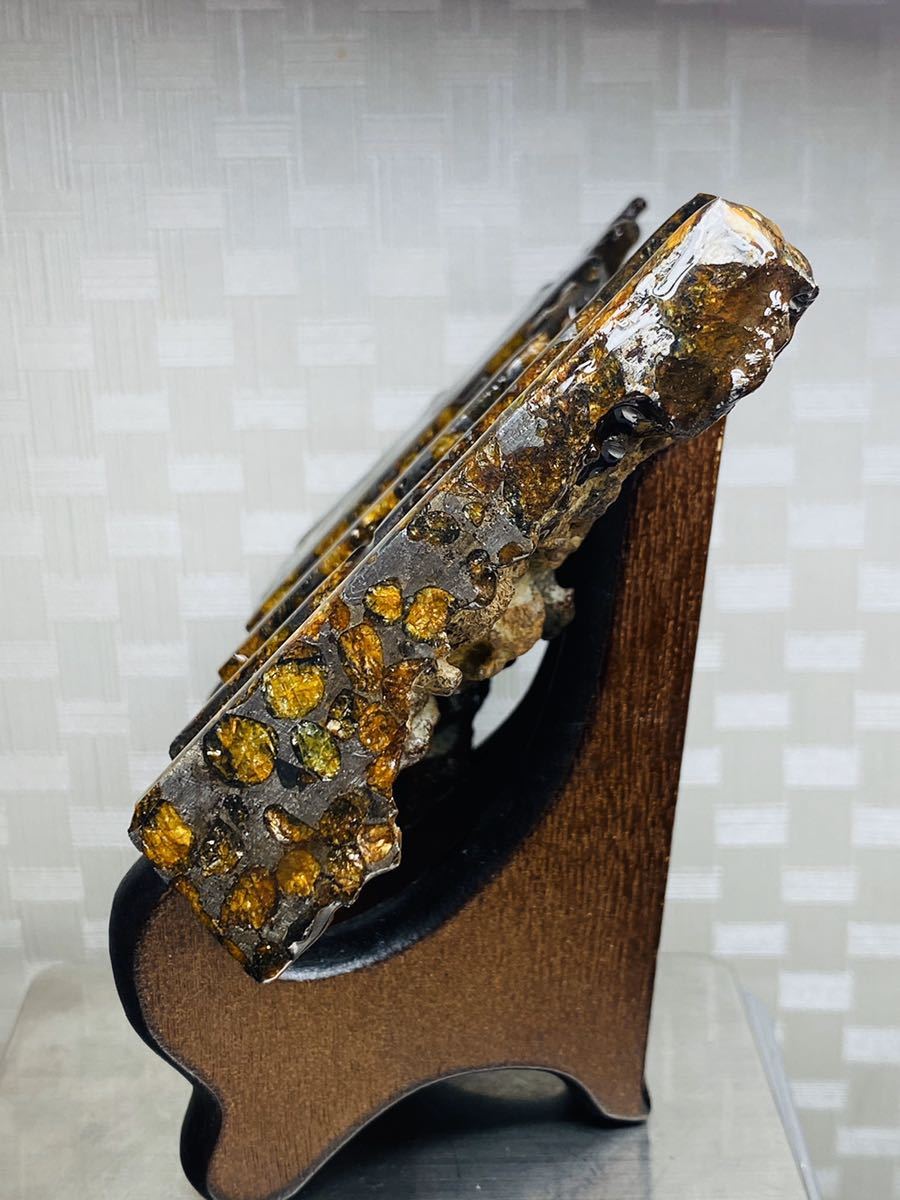 背面は落下時の原始状態です!かんらんも風化少ない最高に綺麗な高品質パラサイト隕石★宇宙・隕石★パラサイト隕石★374㌘+110mm★ケニア・セリコパラサイト★コーティング済み★室外光★