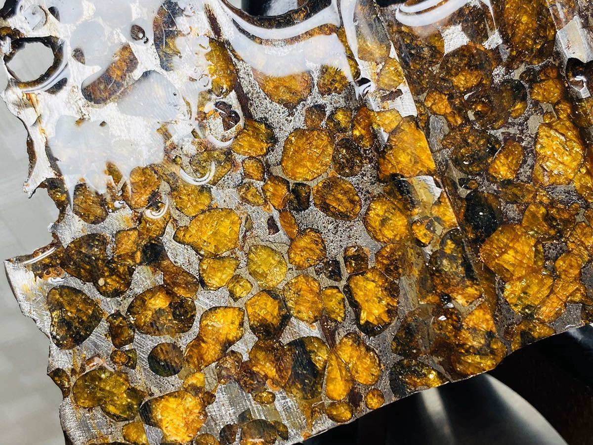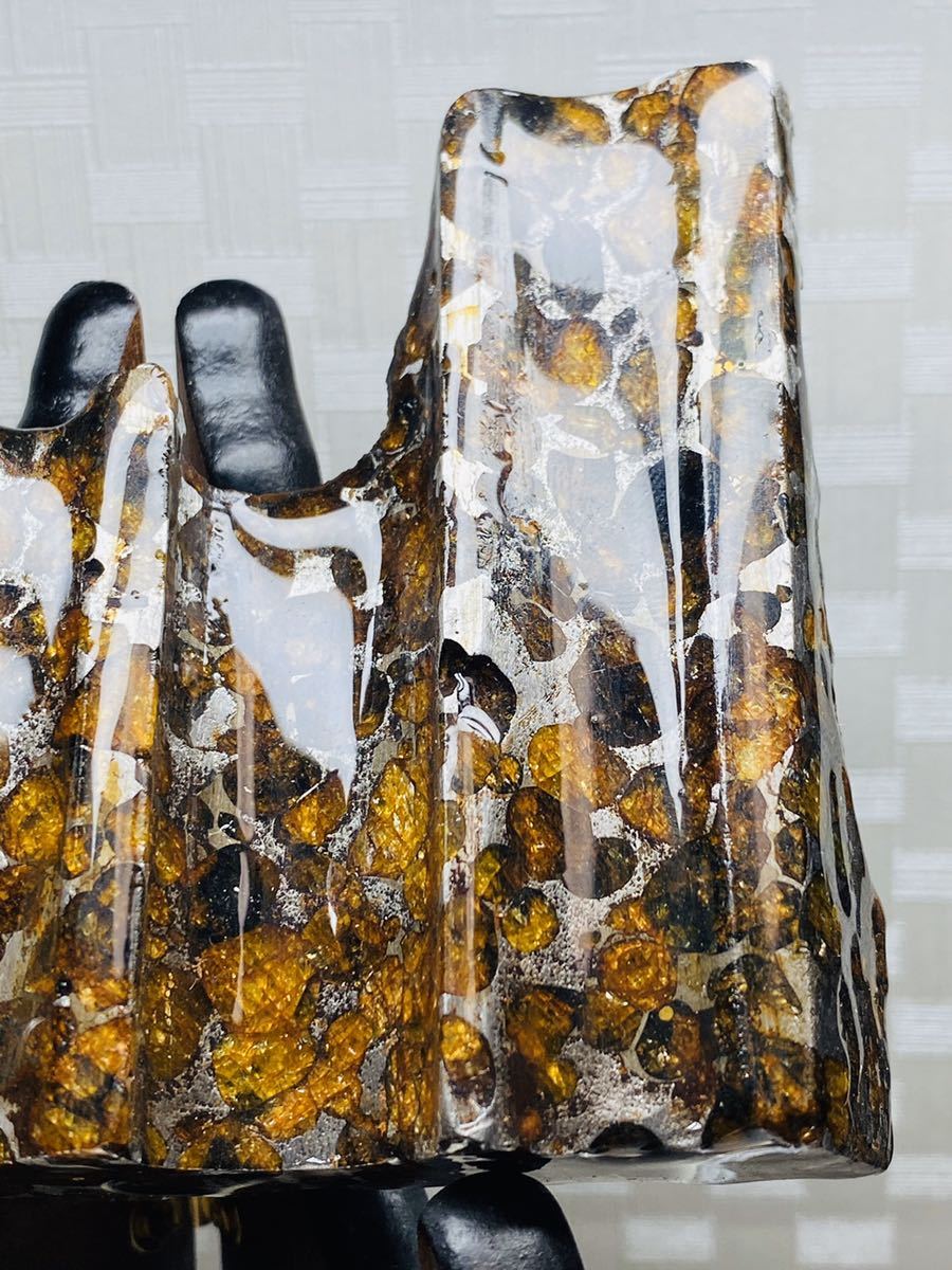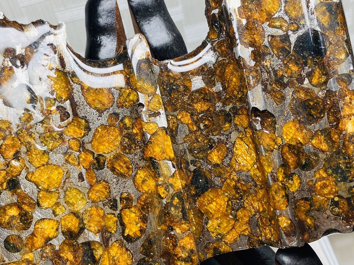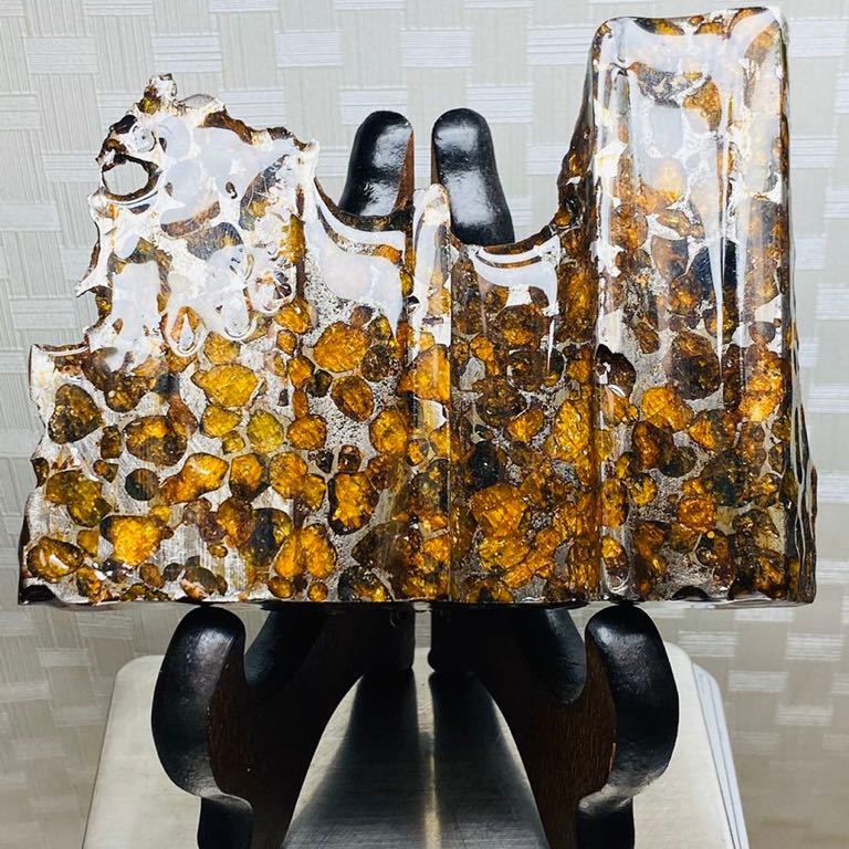 背面は落下時の原始状態です!かんらんも風化少ない最高に綺麗な高品質パラサイト隕石★宇宙・隕石★パラサイト隕石★374㌘+110mm★ケニア・セリコパラサイト★コーティング済み★室外光★