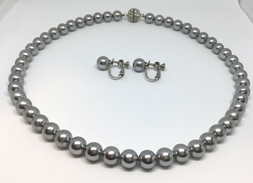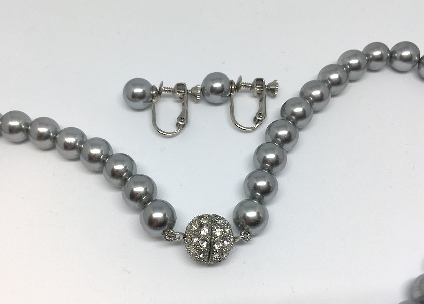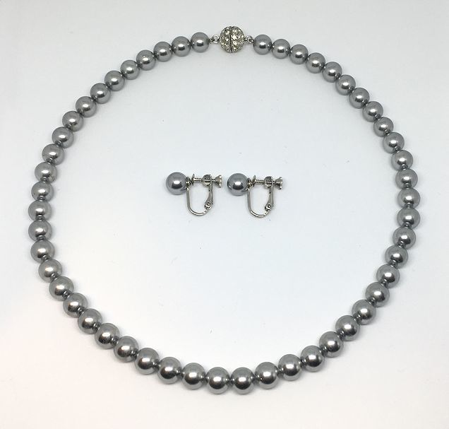 シルバーグレー・パール・8mm玉・フォーマル・ラインストーンパヴェクラスプ・ネックレス・イヤリング・セット