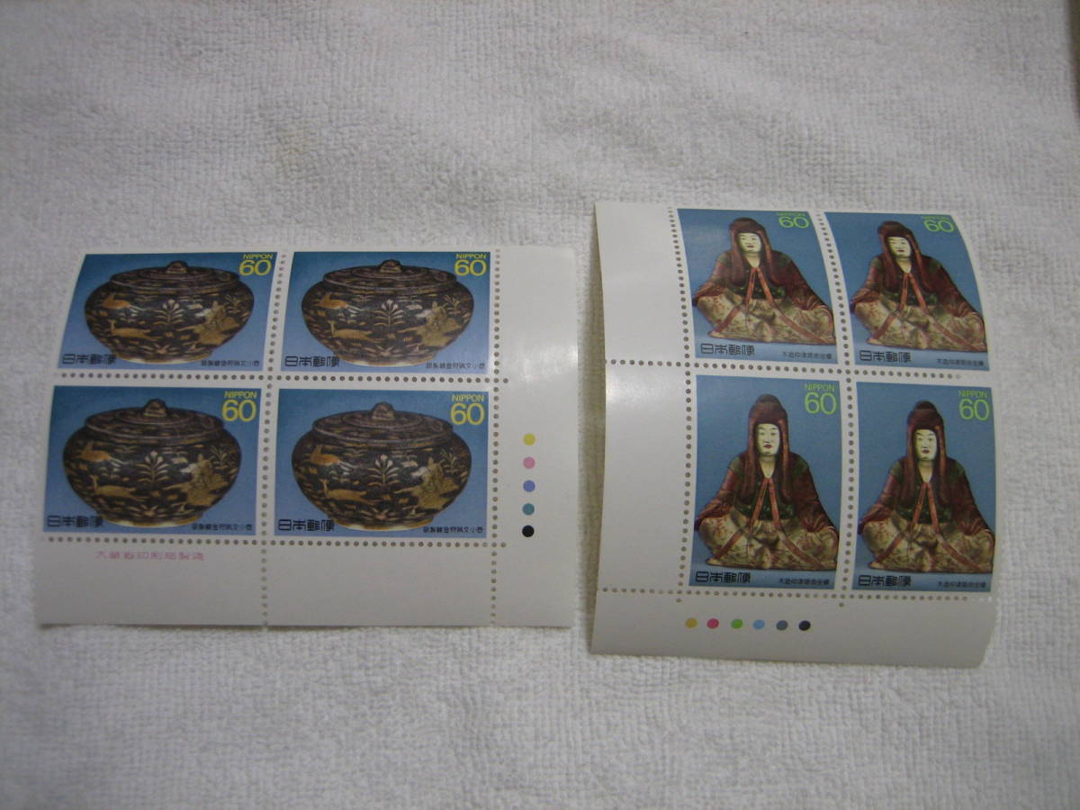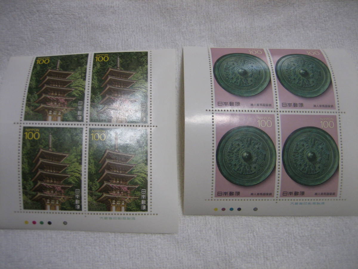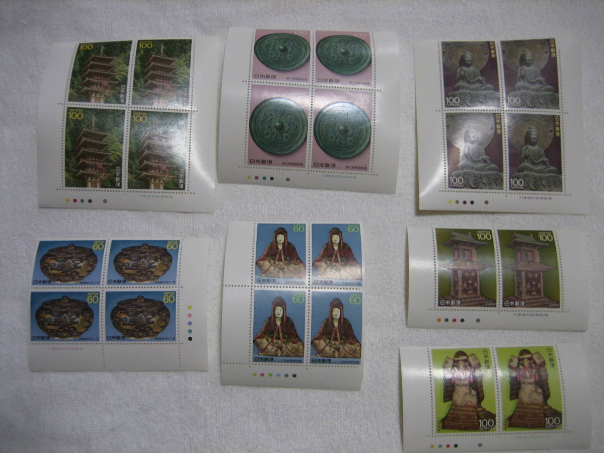 切手 国宝シリーズ カラーマーク 室生寺五重塔/神人車馬画象鏡/銅造薬師如来像/銀製鍍金狩猟文小壺/木造仲津姫命坐像/玉虫厨子/小桜韋威鎧