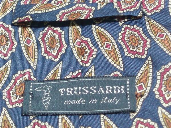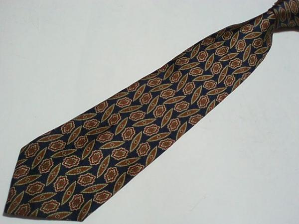 新品同様美ユーズド品。トラサルディ(TRUSSARDI)ネクタイ。素材は不明ですが手触りはシルク(絹)です。大剣最大幅約10センチ。イタリア製。ベースの色は紺色ネイビー系。模様は茶色ブラウン系です。若干シワっぽいです。大剣幅がワイドな幅広のネクタイです。素材の特性でシワや折り皺があります。状態は悪くありませんが(主観)ユーズド品(古着)なのでユーズド品(古着)にご理解のある方のみオークションに参加して下さい。注意しながら検品をしていますが、多数のネクタイを出品している為もしかしたら多少の変色、シミ等の見逃しもあると思います。トラブル防止の為、多少の変色、シミ等の見逃しを許せない方もオークションに参加しないで下さい。