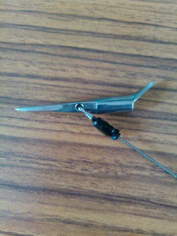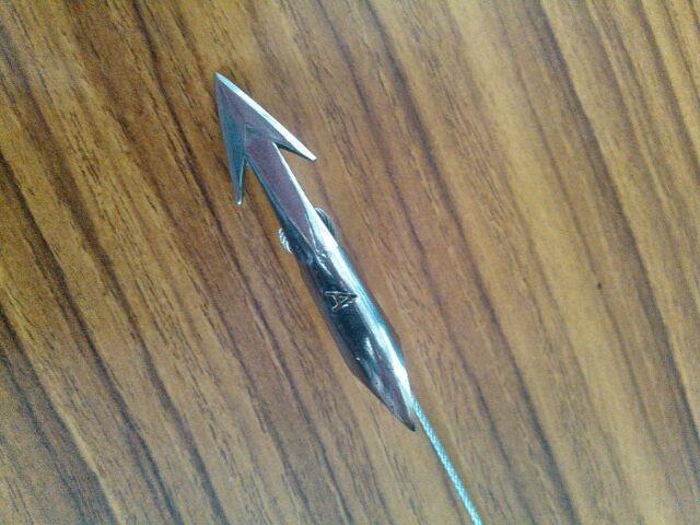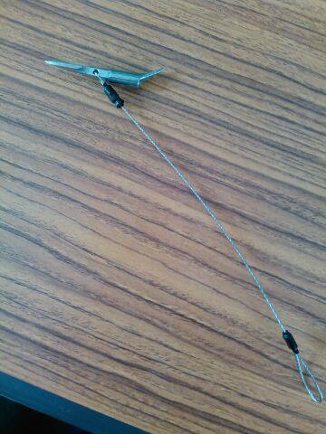 手銛自作用 ミニモリッパ M 約13cm 径1mmステンワイヤー付き  AK 6408 1本 長さ55mm 全体の長さは、55mm、先端に近い部分のカエシの幅は12mm、後部のカエシの長さは11mm (いずれも実測)、押し棒を挿入する穴は、4.5mm、 押し棒を挿入する穴は、加工することにより大きくすることは、可能です。