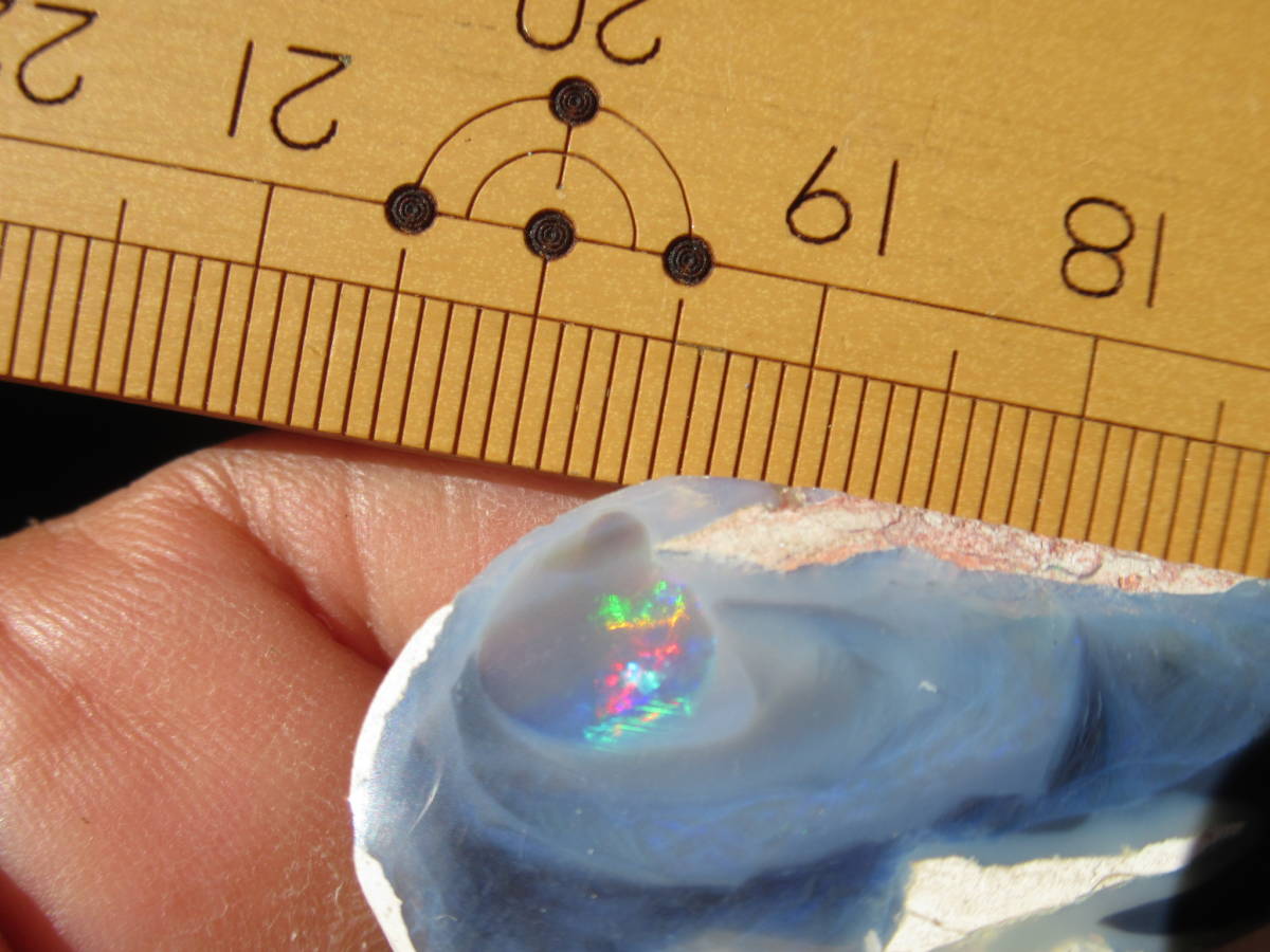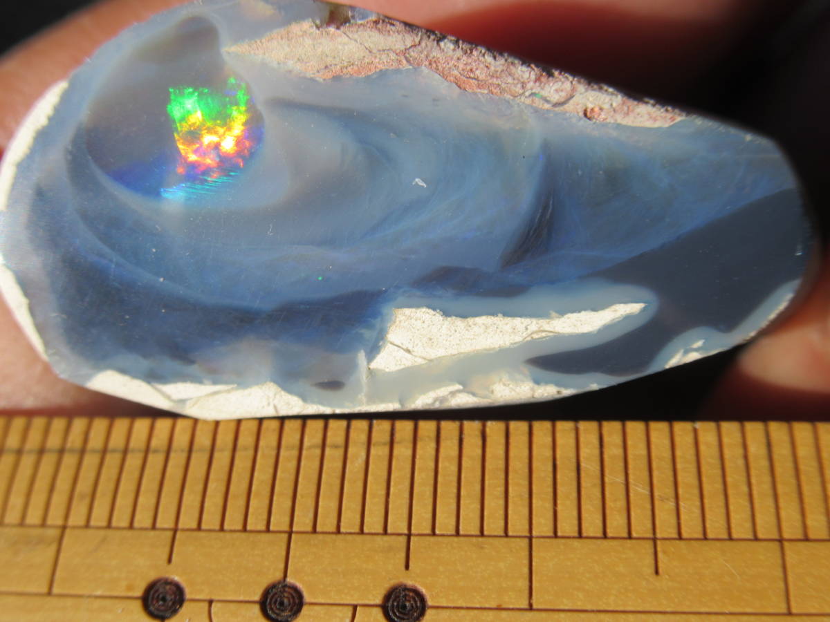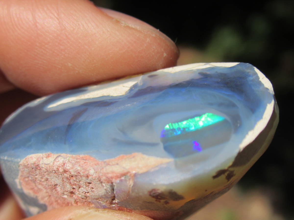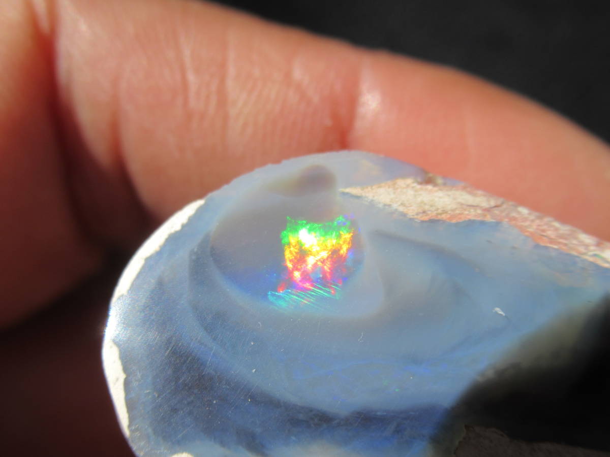 オーストラリアのライトニングリッジ産ブラックないしセミブラックオパールの原石切断品でペアではなく片方のみ。切断面が研磨してあり、そこにいびつな同心円構造が見られ層によって黒から灰色のゾーニングで濃淡があり、各層の生成時期の有機物濃度が変化したようです。その中心部の9mm/8mmの楕円形部分に遊色が有り方向により赤から青紫色の多彩な色が見られます。この遊色部分には透明感が有り反対側からペンライトで照らすと逆光で内部が見られます。外側はオパール本体に沿って荒削りされていますが、外側にはライトニングリッジ特有の明るい色の粘土質が残っています。研磨面のサイズタテヨコおよそ37/19mm、研磨面を底辺として高さ28mm。重さ14,4g。送料無料。