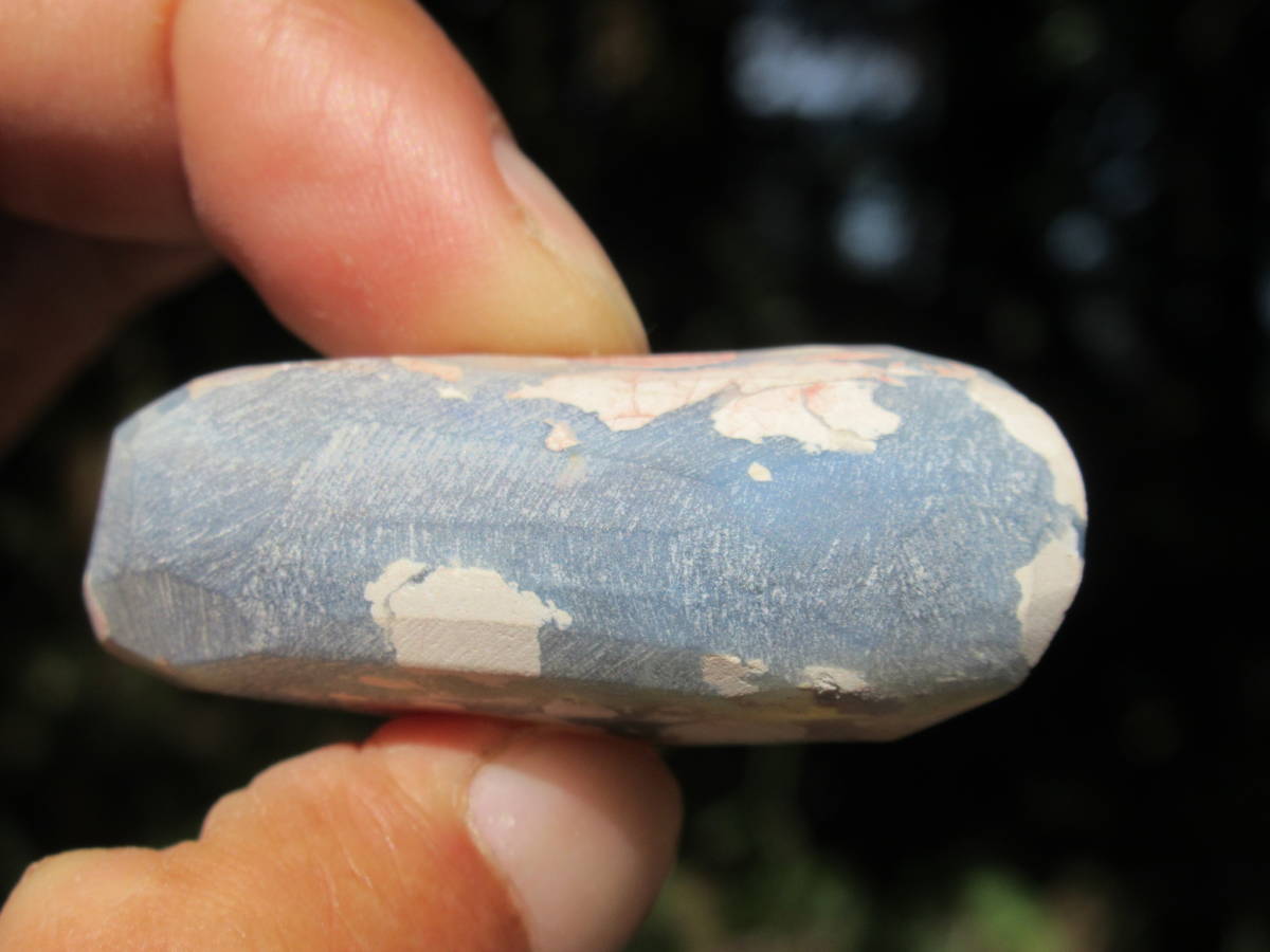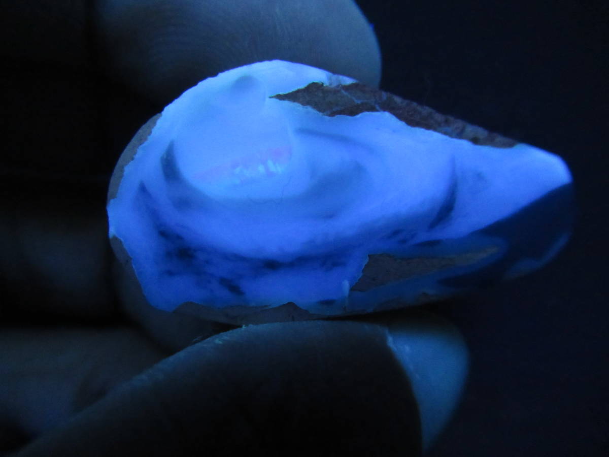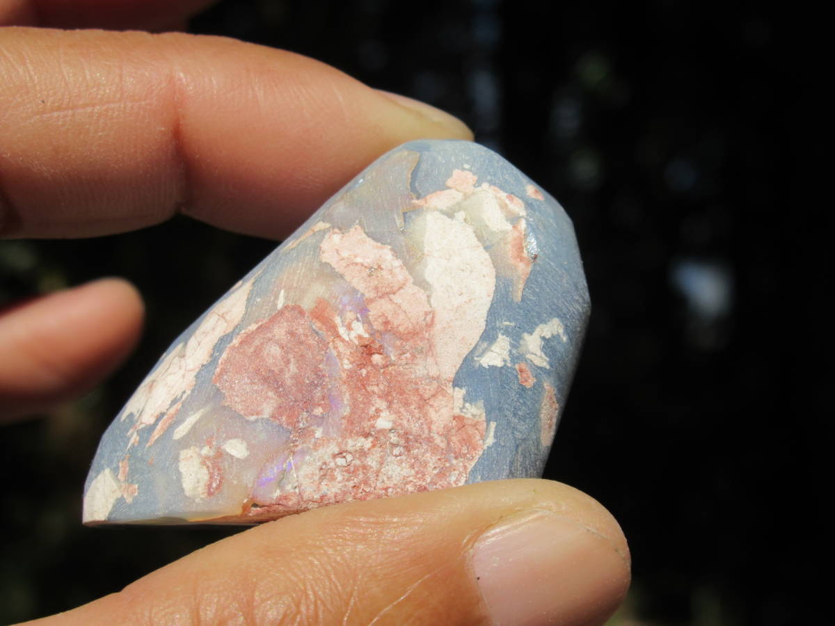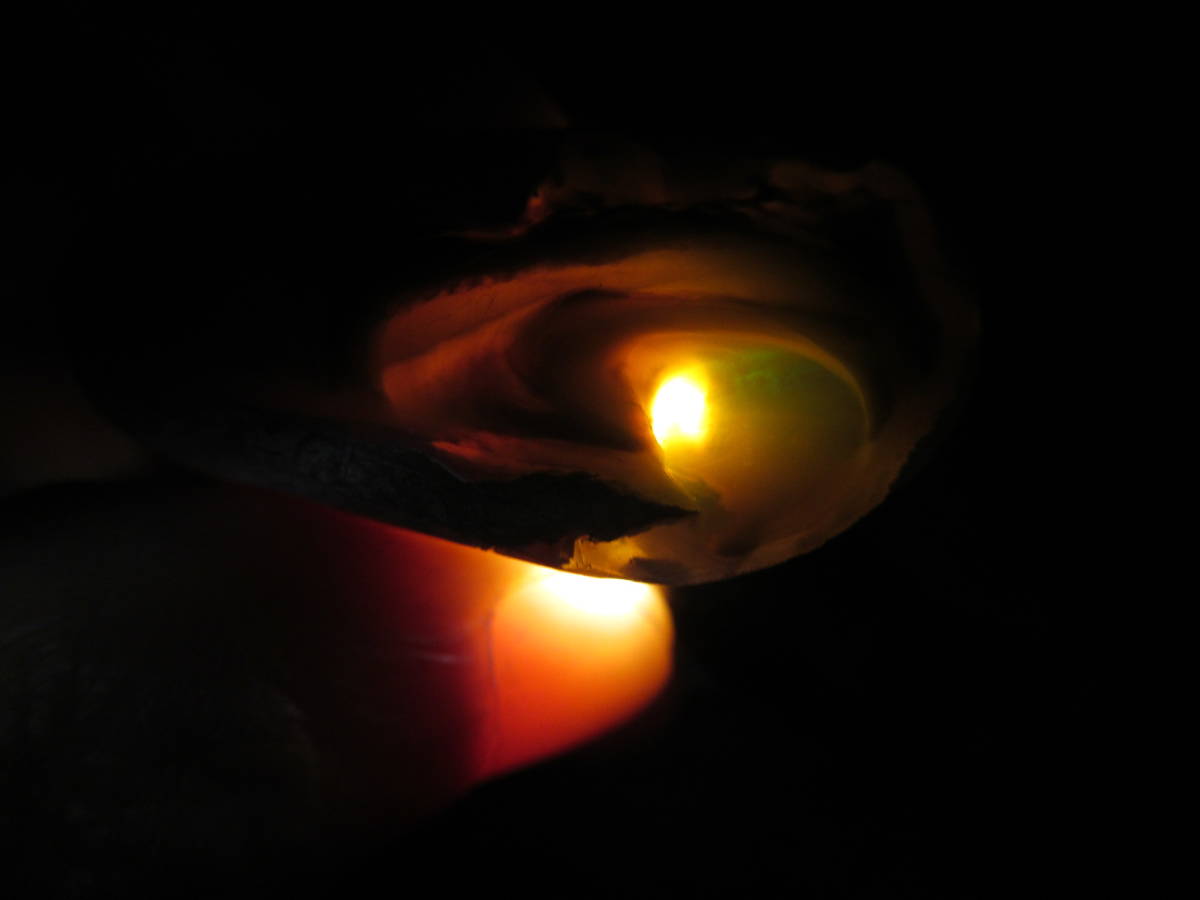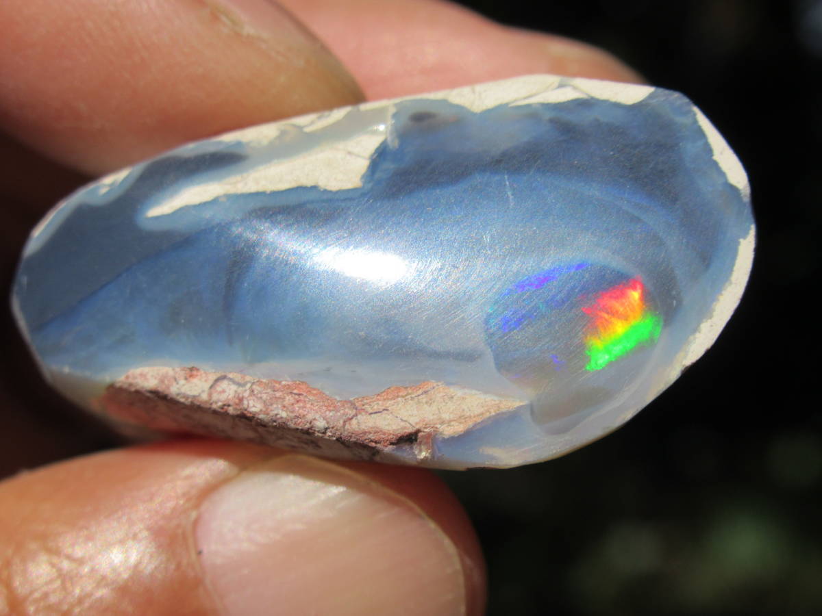 オーストラリアのライトニングリッジ産ブラックないしセミブラックオパールの原石切断品でペアではなく片方のみ。切断面が研磨してあり、そこにいびつな同心円構造が見られ層によって黒から灰色のゾーニングで濃淡があり、各層の生成時期の有機物濃度が変化したようです。その中心部の9mm/8mmの楕円形部分に遊色が有り方向により赤から青紫色の多彩な色が見られます。この遊色部分には透明感が有り反対側からペンライトで照らすと逆光で内部が見られます。外側はオパール本体に沿って荒削りされていますが、外側にはライトニングリッジ特有の明るい色の粘土質が残っています。研磨面のサイズタテヨコおよそ37/19mm、研磨面を底辺として高さ28mm。重さ14,4g。送料無料。