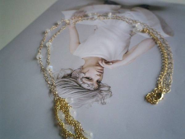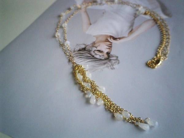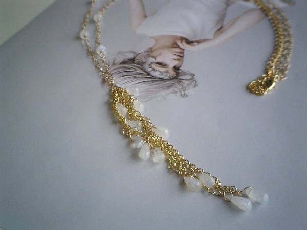 切ない恋・・シリーズです♪月の光の中で・・幻想的なムーンストーンのネックレスです♪ロンデルやドロップのムーンストーンにハートのデザインチェーンを合わせて可憐な表情です♪本体には5~6ミリ位のムーンストーン、トップのチェーンには4ミリ~8ミリ位までのドロップのムーンストーンを散らしました♪長さは78センチ+アジャスター14センチで最長92センチ、トップは11センチ位です♪お揃いのブレスレットも出品しています♪シンプルで飽きのこないいつまでも着けられるデザインを考えて作りました♪ハンドメイドをご理解頂いてノークレーム、ノーリターンでお願いします