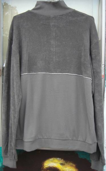 チャコールグレイに後染めしたパイルの切替ジャージです。上下の切替部分にラメパイピングを使用してます。(シルバー)