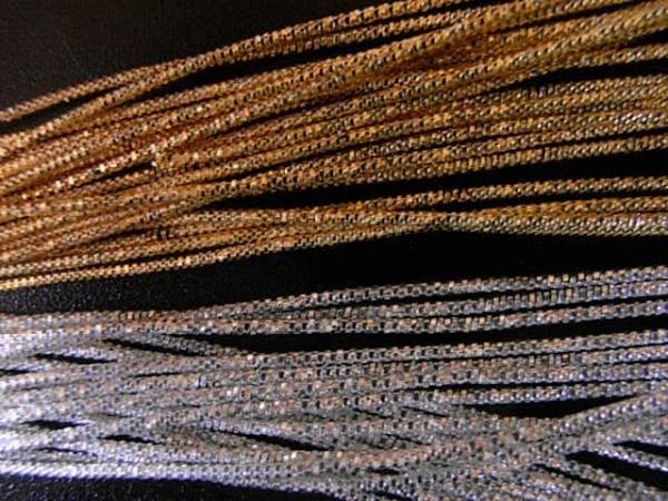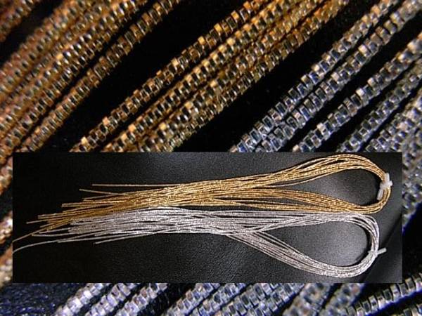 金モール+銀モール『キラキラ』タイプ 1本は約38センチ メタリック素材 金モールx10本+銀モールx10本の合計:20本 直径:1.1ミリ 新品 使い方は通常の金銀モールと同じく真ん中に糸を通して使います。 当社のホームページ、左側の目次の上から2番目『金モール刺繍入門』と10番目B2B『素材宝庫』をご覧ください。 |