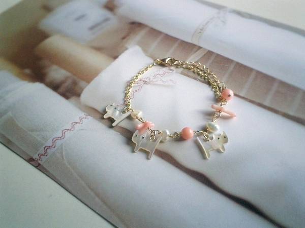 物語をアートして・・シリーズです♪猫とお散歩・・キュートな猫さんのブレスレットです♪春色の珊瑚や淡水パールにシェルの猫さんを合わせてロマンチックな表情です♪ピンク珊瑚の丸玉やさざれにバロックの淡水パールや14×12ミリ位のホワイトシェルの猫さんを合わせました♪長さは全長23センチ位で調節自由です♪お揃いのネックレスも出品しています♪シンプルで合わせやすいデザインです♪♪ハンドメイドをご理解頂いてノークレーム、ノーリターンでお願いします