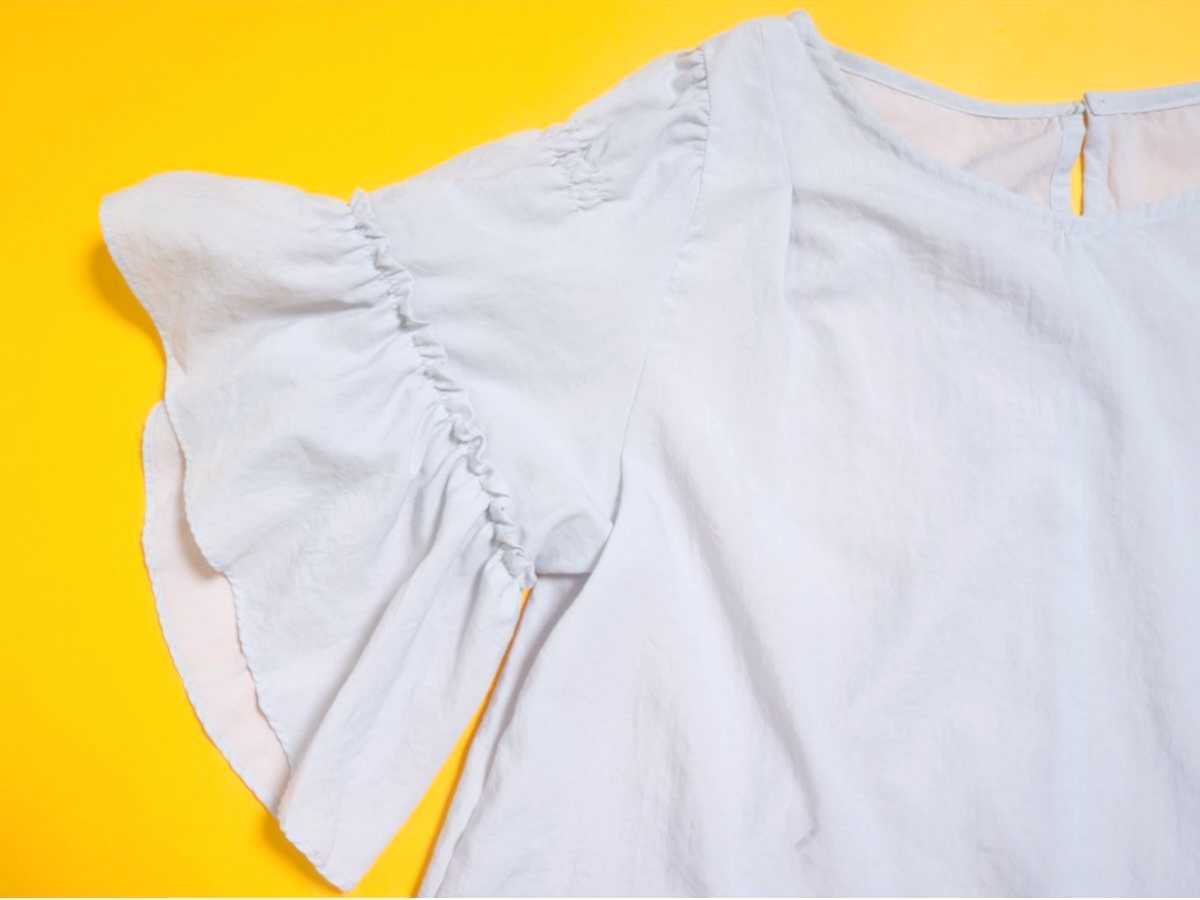 袖のシフォンフリルのデザインが上品で、とても素敵な大人カジュアルカットソーです。気になる二の腕もふんわりと素敵に隠す事ができます。寒くなってくる季節には、中にタートルネックのニットなど来ていただければ暖かく年中着れます。