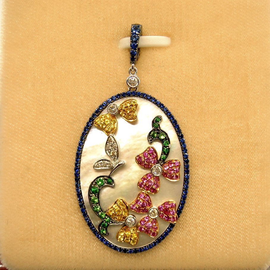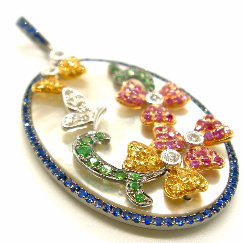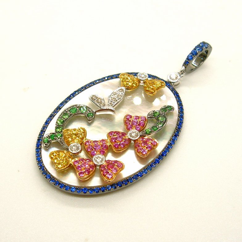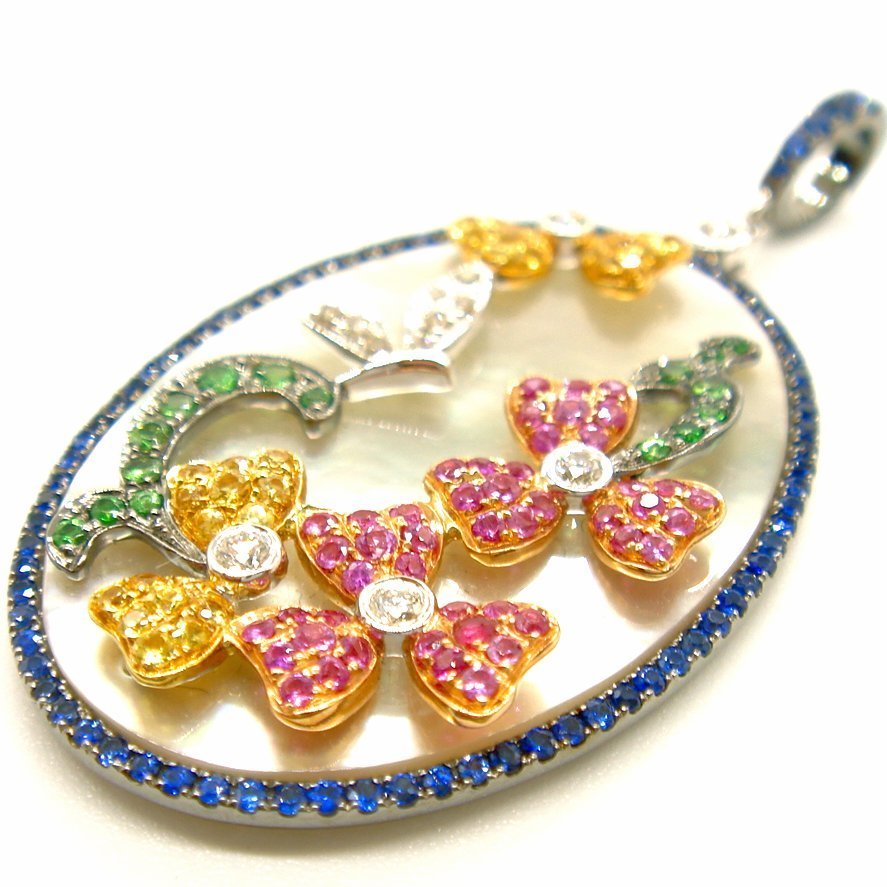 PE873:K18/3色 カラーサファイア G/ガーネット 白蝶貝 ダイヤ ペンダント