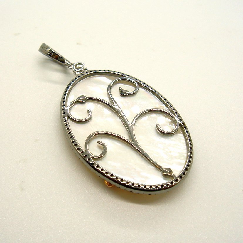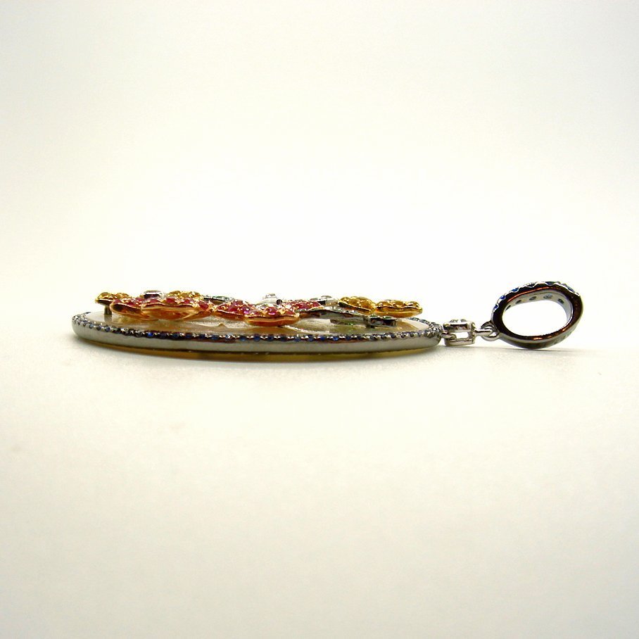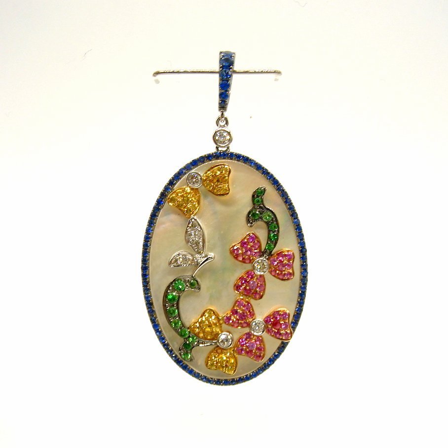 多色に輝く白蝶貝と言うキャンバスの上に宝石で描かれた絵画の様なペンダントです。