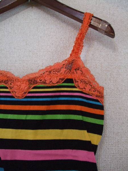 | 商品紹介 | 鮮やかなマルチボーダーがオシャレなキャミソールです。 肩紐と縁のオレンジのレースもステキです。 素材:コットン100% レース部分:ナイロン80% ポリウレタン20% |