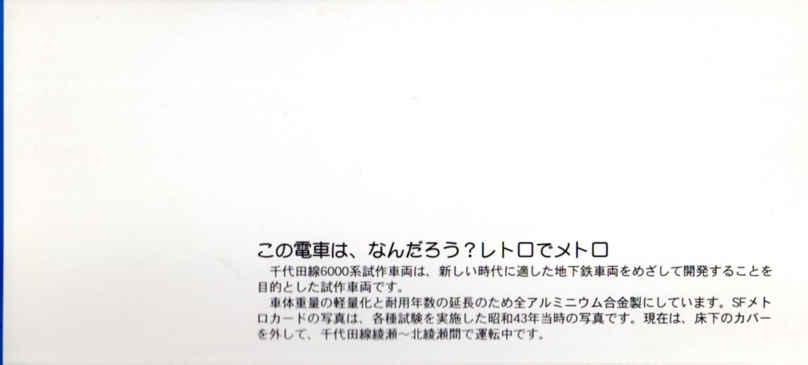 営団地下鉄(現・東京メトロ)から発売された「鉄道の日記念」のSFメトロカード、使用済みです。 画像は1~2番目がカードの絵柄、3~4番目がカードの台紙の表裏、5~6番目が台紙を開いた状態の上下です。 カードの画像に縞模のような状態が生じていますが、スキャナーによる問題でカードには異常はありません。 |