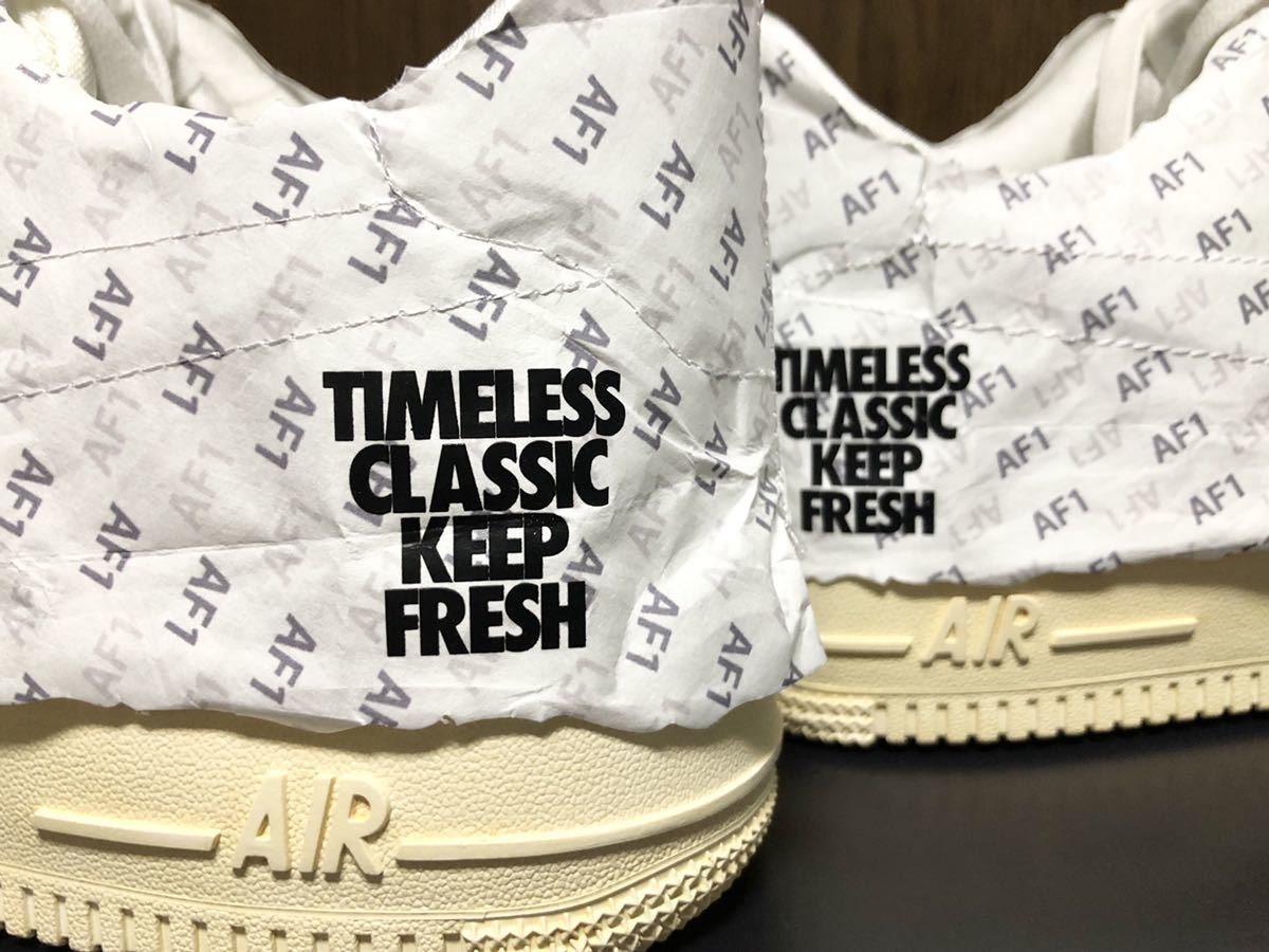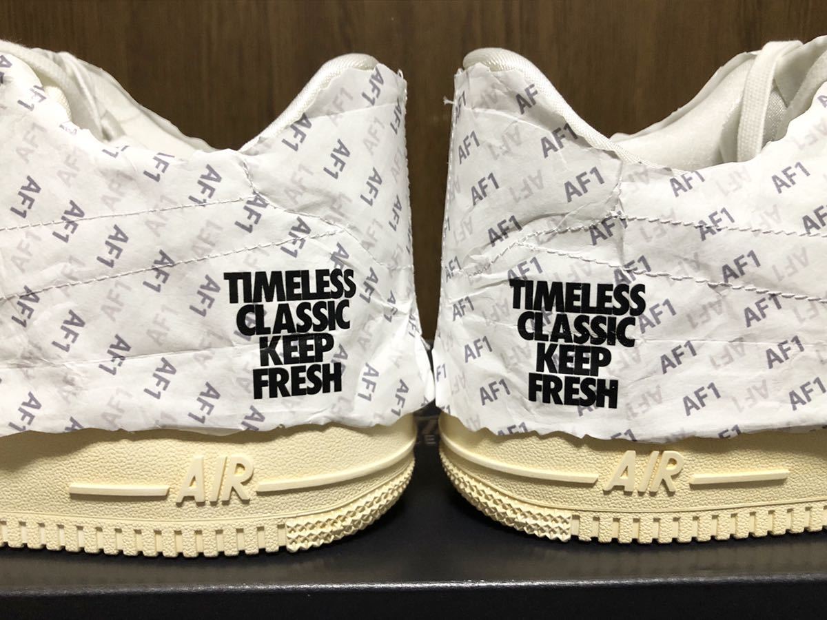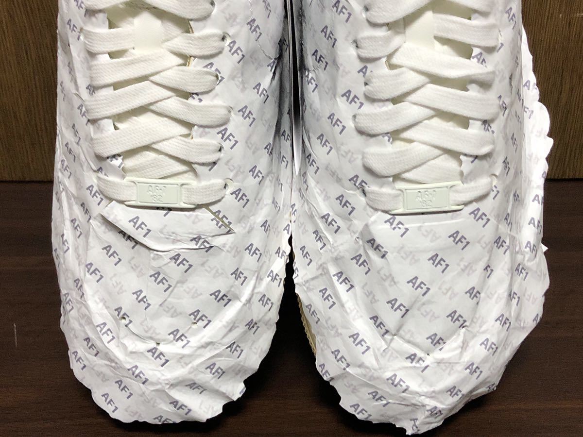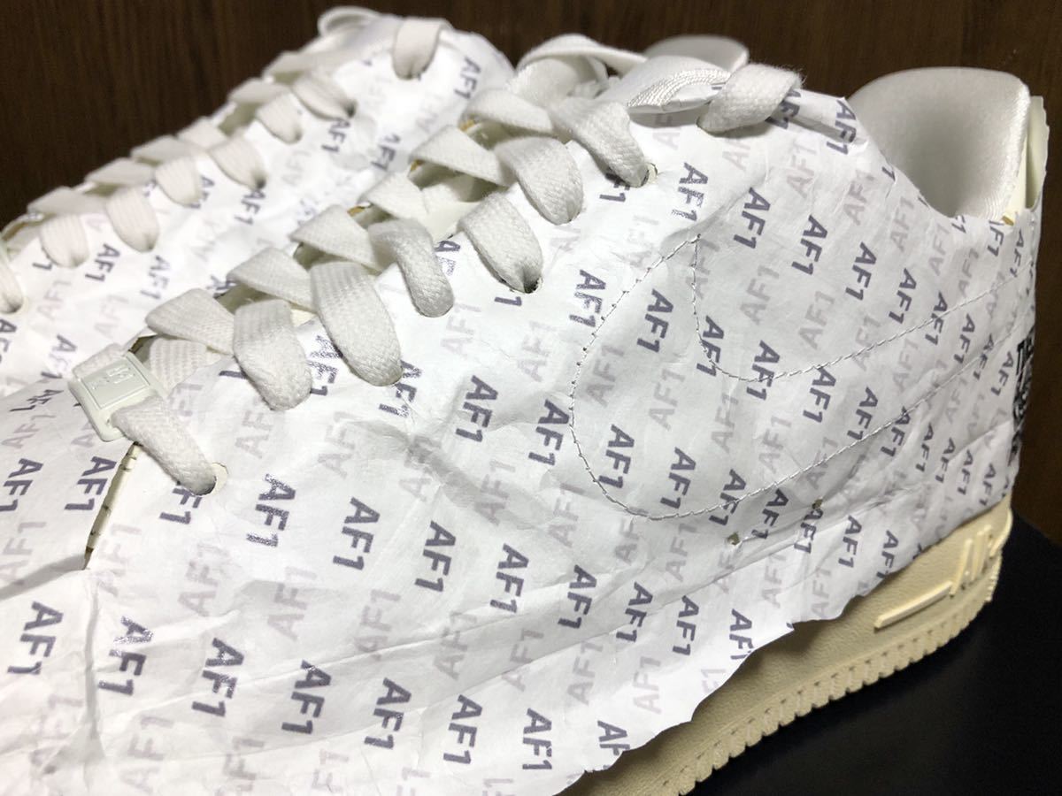 アッパーはタイベック製の紙がスニーカーを包んでおり、タイベックを取るとビンテージ加工が施されたホワイトレザー、タンの部分は合成皮革です。