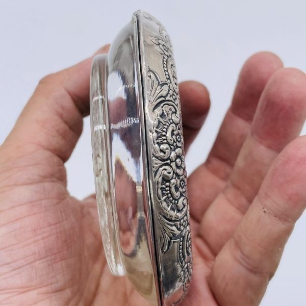 年代 :1950's辺り サイズ :直径9.7cm 内径7.2cm メーカー :Frank M Whiting & Co 素材 :STERLINGSILVER(銀925)/クリスタルガラス 重さ :約 155g アメリカで買い付けたビンテージ、ドリンクコースターになります。 立体感のあるエンボス加工のフローラルデザインが施されており高級感抜群です。 1カ所、ダメージがありますが表面では無いので問題ないかと思います。 (最後の画像で確認ください) ドリンクコースター以外にも、小物ホルダー等にも活用いただけるかと思います。 純銀の深みのある色合いが良く、アンティーク感抜群の1点物となっております。 出品している全ての商品は古い物のため細かいキズや使用感はありますので ビンテージ品として理解頂ける方のみ入札下さい。 他にも世界のアンティーク雑貨等、多数出品しておりますので宜しければ マイオークションからご覧ください ↓↓↓ ![]() サイズは出来る限り正確に測っておりますが、多少の誤差はご了承ください。 写真をしっかりとご確認の上、入札して下さい。 (神経質な方はご遠慮下さい) 質問などありましたらお気軽に問い合わせ下さい。 尚、細かい写真など詳細をご希望の方は拡大写真を送りますので、質問欄にご希望の旨とメールアドレスをお載せ下さい。 (ご質問内容は公開される事はございません。ご安心下さい) まとめて取引から同梱可能です。(梱包サイズが変わると送料も変更となります) | |||
