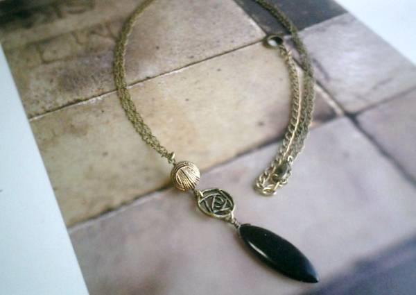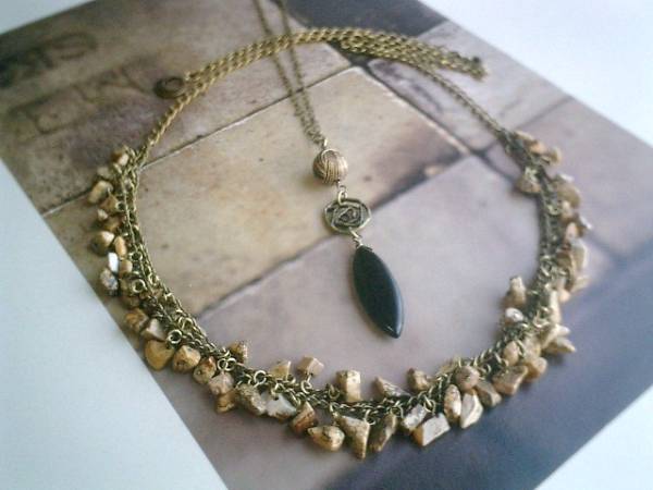 コゼットの裁縫箱・・シリーズです♪シックな黒とベージュ・・ブラウンとベージュの模様がキュートなピクチャージャスパーとオニキスのネックレス2点セットです♪漆黒のオニキスとベージュブラウンのジャスパーがアンティーク・モダンな表情です♪3ミリから7ミリ位のさざれのピクチャージャスパーは2連のチェーンに繋いでシックなデザインです♪長さは全長73センチ位で調節自由です♪チョーカー風にされても可愛いです♪華奢なチェーンに合わせたオニキスは32×12ミリ位のマーキスです♪薔薇の透かしチャームやアンティークビーズを合わせてキュートです♪長さは82センチ位で調節自由です♪それぞれ単品やブレスレットやイヤリングも出品しています♪シンプルで飽きのこないいつまでも着けられるデザインを考えて作りました!ハンドメイドをご理解頂いてノークレーム、ノーリターンでお願いします