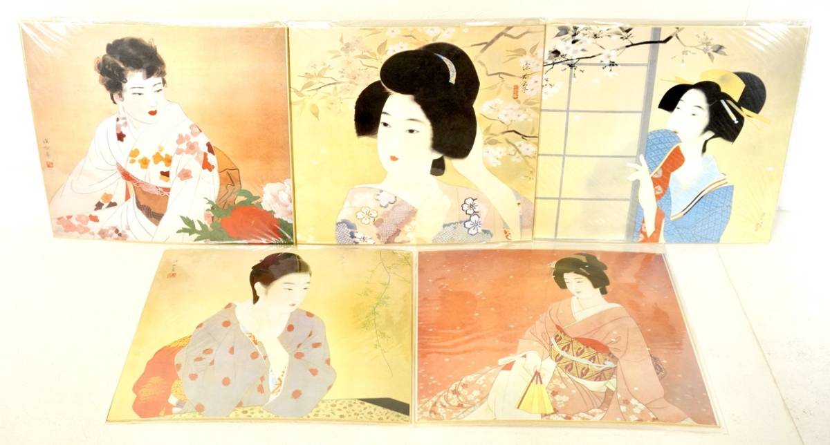 日本美術・美人画の名手 伊東深水 春の名作 複製画色紙5枚揃え 「春の夕映え・富貴花・春宵・春宵・惜春」 ISM