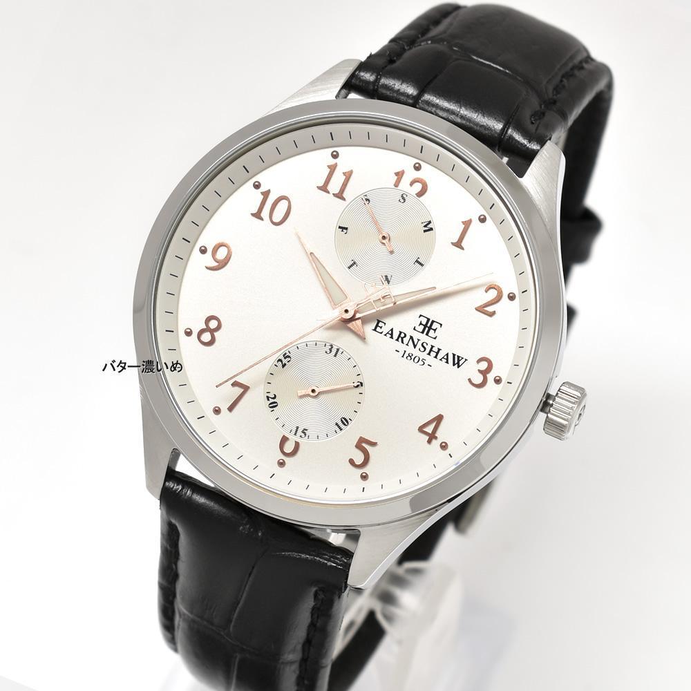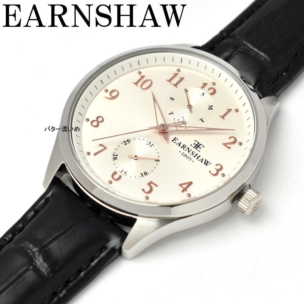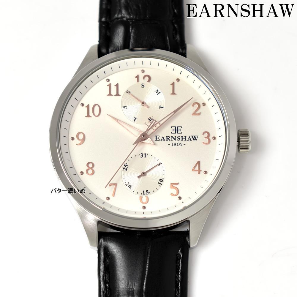 EARNSHAW 腕時計 メンズ クオーツ ブラック革ベルト レザーベルト ES-8079 クラシック ホワイトアイボリー文字盤 新品
