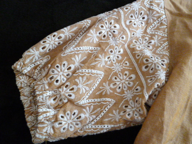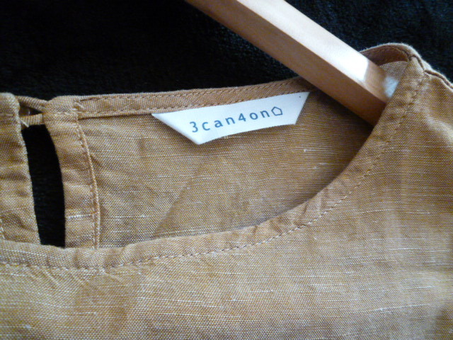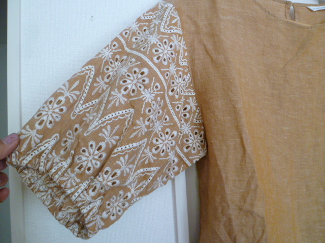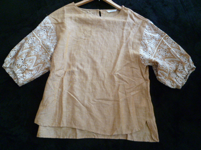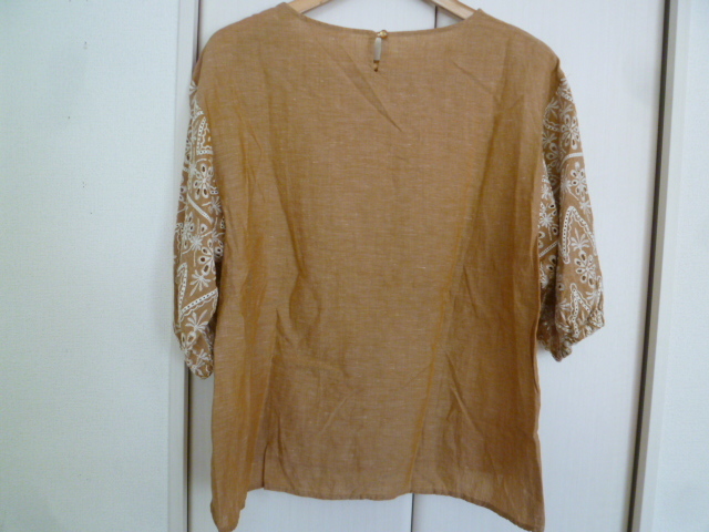 3can4on/サンカンシオン△茶系袖刺繍デザインゆったりブラウスカットソー/ワールドブラウン系麻混リネントップス△BO61