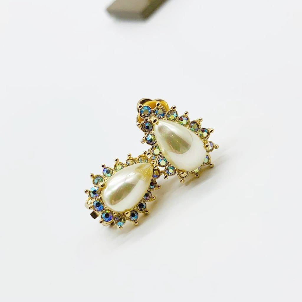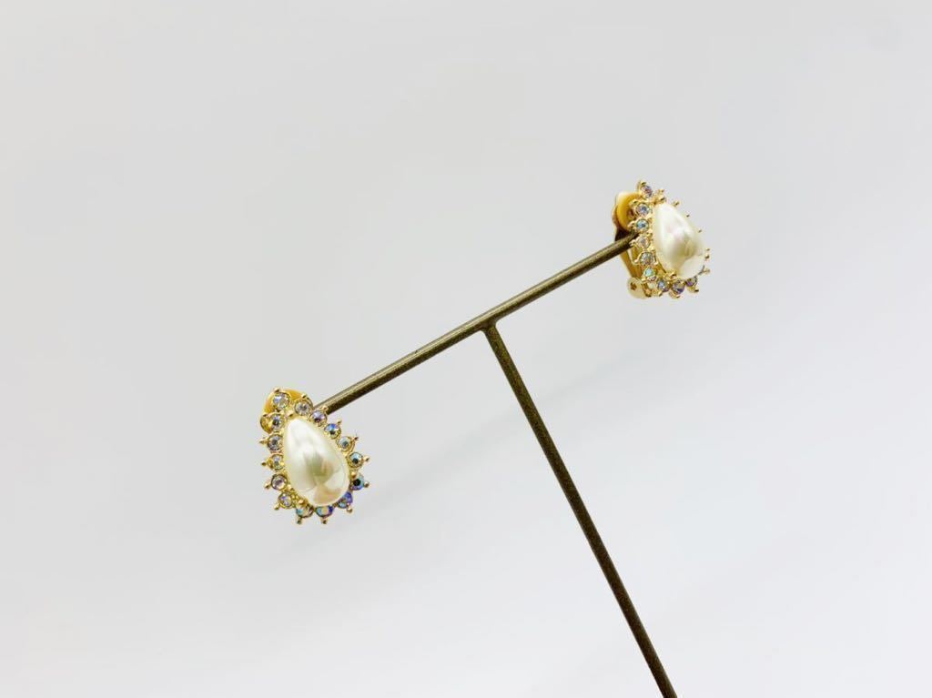虹色の光沢を含む雫型のパール をレインボーストーンが取り巻き華やかな雰囲気が素敵なイヤリングです。