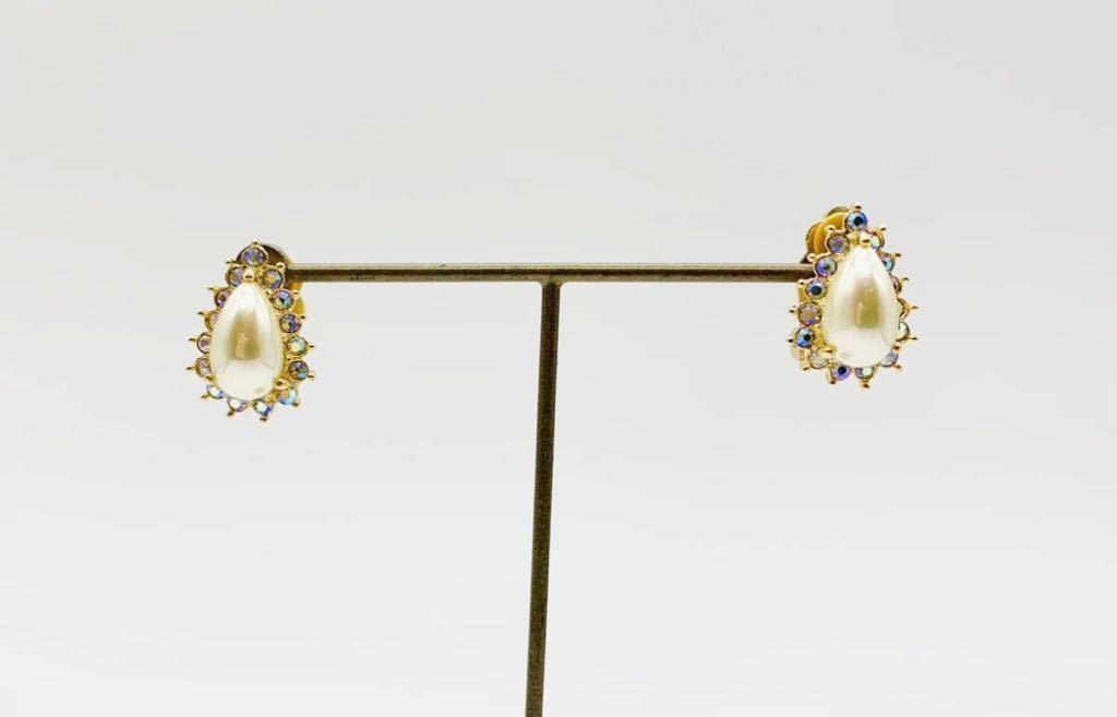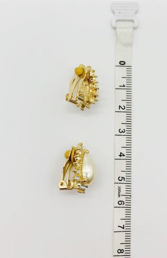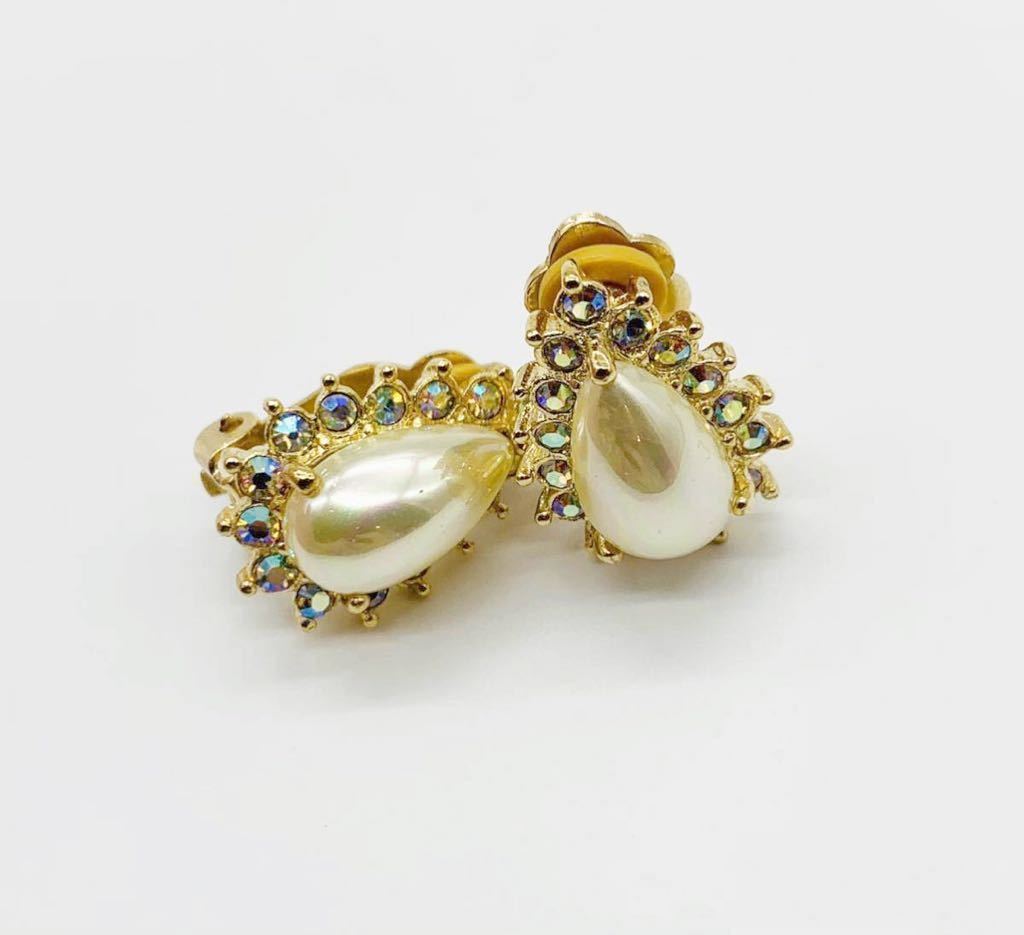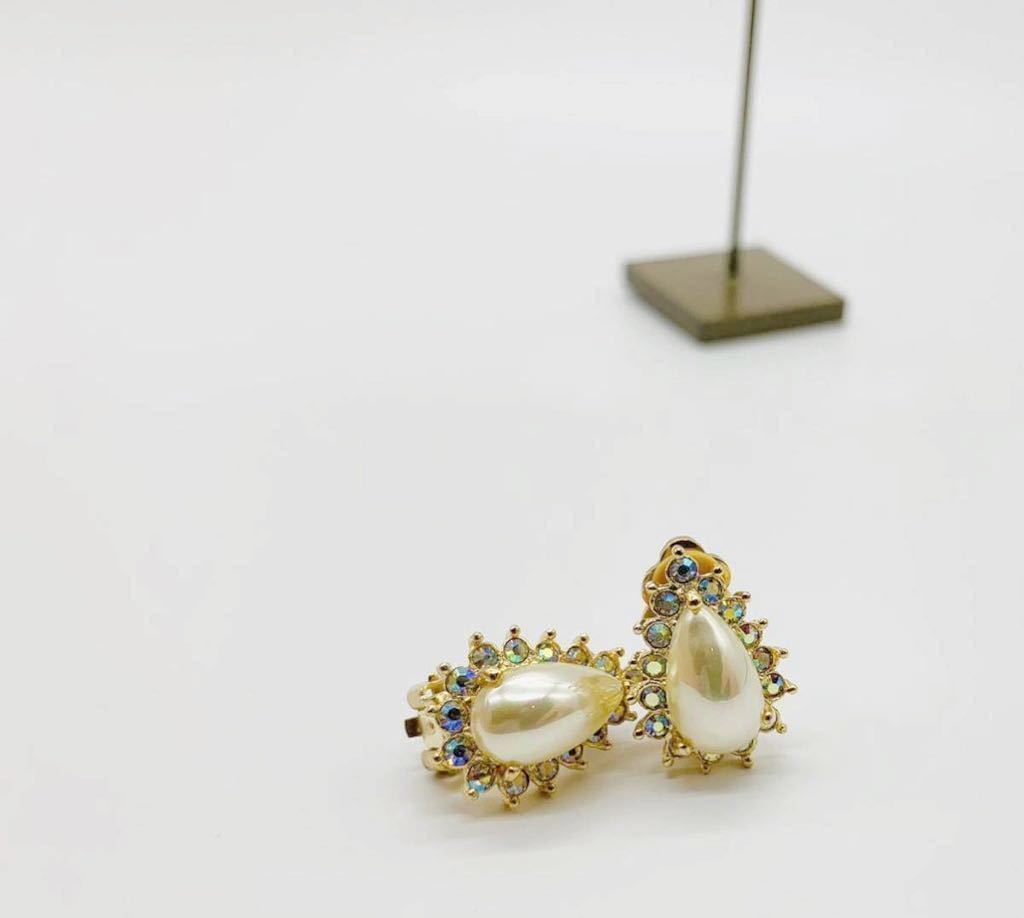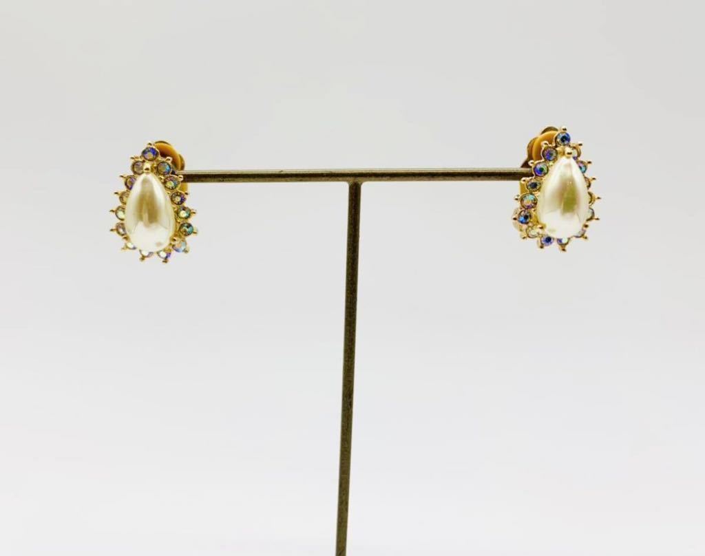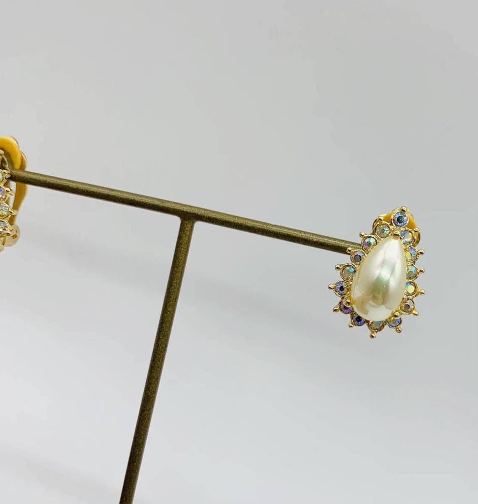 【美品】フランス パリ購入 ヴィンテージ ROMAN ローマン ティアドロップ パール レインボーラインストーン ゴールド イヤリング 雫型