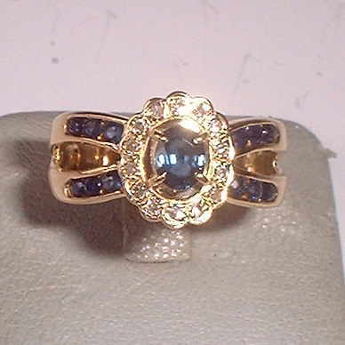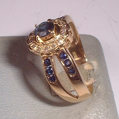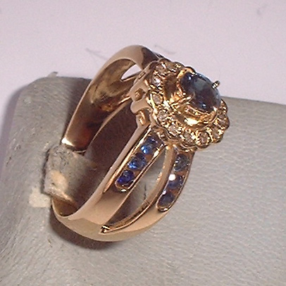 中央のサファイアの廻りは14石のダイヤが取り巻いております。