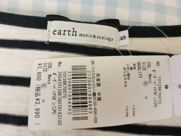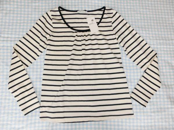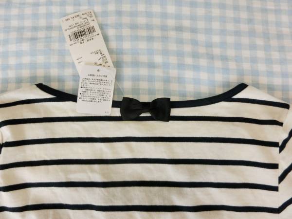 定価3990円 色はキナリと紺のボーダー 首の後ろに紺のリボンあり。 素材:綿100% サイズS 肩幅34cm胸幅40cm袖丈59cm着丈57cm
