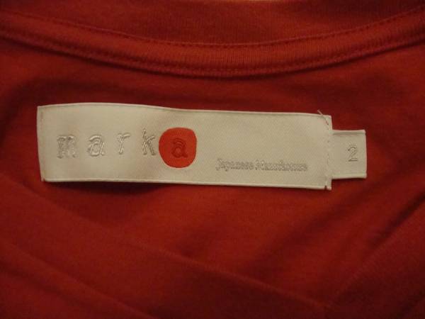 マーカのTシャツです。色はレッド系です。サイズ表記は2です。実寸は、肩幅44センチ、身幅48センチ、着丈63センチになります。誤差はご容赦ください。状態は、ほとんど着用していないこともあり、美品といえると思います。中古品ですので、ご理解いただける方の入札をお待ちしています。落札後は、ノークレーム、ノーリターンでお願いします。送料はこちらで負担しますが、発送方法はお任せください。また、お手数でも自己紹介欄をご覧のうえ入札してください。不明な点は事前にご質問ください。他にもいろいろ出品していますので、商品リストをご覧下さい。よろしくお願いします。
