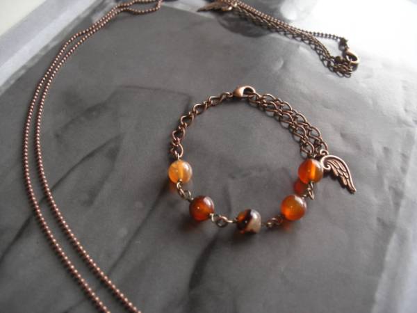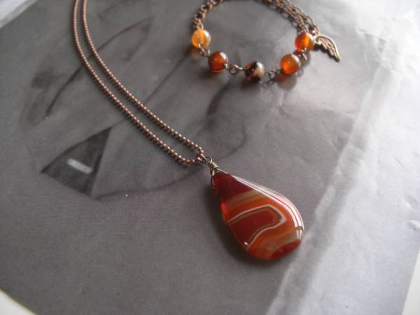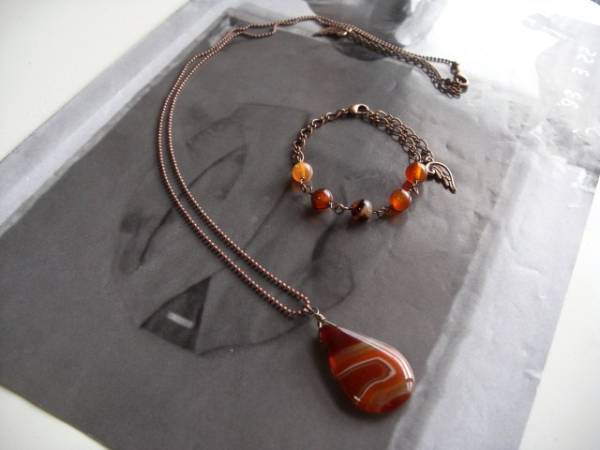 愛らしさの定番・・シリーズです♪カーネリアン気分・・シックなカーネリアンのネックレスとブレスレットの2点セットです♪丸玉やフラットオーバルのカーネリアンはナチュラルな模様がアートな表情です♪ネックレスのトップは35×22ミリ位のフラットドロップです♪長さは68センチ+アジャスター10センチで最長78 センチ位です♪♪ブレスレットは8ミリの丸玉のカーネリアンをランダムに繋いでいます♪長さは全長23センチ位で調節自由です♪シンプルで長く着けていただけるデザインを考えて作りました♪ハンドメイドをご理解頂いて ノークレーム、ノーリターンでお願いします