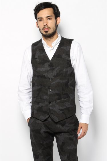 ウォーム感溢れるウール素材にカモフラージュ柄をプリントしたベスト。