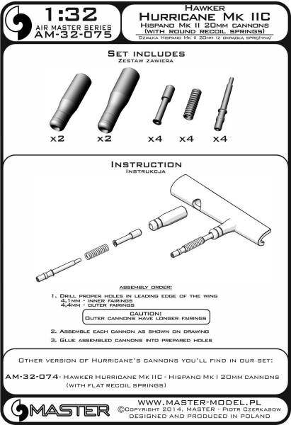 | ホーカー・ハリケーンMk.ⅡCに搭載されたイスパノMk.Ⅱ 20mm機関砲身の4本セットです。リコイルスプリング(ばね)が大型になったタイプです。真鍮削り出し。1/32スケール用。新品です。32-075 | ||