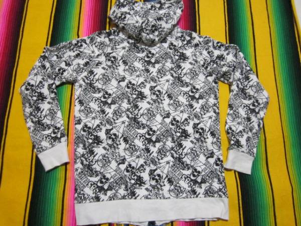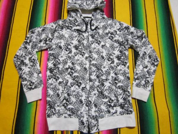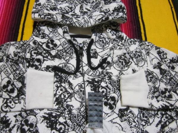 数ある WORLD WIDE LOVE!  コレクションの中でも極めて珍しい、全面に髑髏スカルが無数にデザインされている、1980S ロカビリー、THRASHER、パンクロックテイストのジップアップスウェット...デザインがとてもよい感じです。