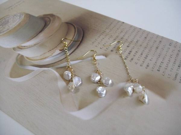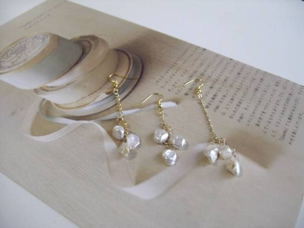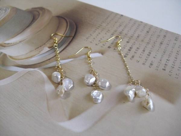 女の子・スタイル・・シリーズです♪やさしいパール・・ふんわりやさしいオフ・ホワイトの芥子パールのピアスです♪長さ違いの3本セットです♪色々な組み合わせで楽しんでいただけます♪9ミリから 11ミリ位の芥子パールを繋いでロマンチックな表情です♪長さは左から7センチ、6センチ、8・5センチです♪イヤリングにも変更出来ます♪お揃いのネックレスやブレス レットも出品しています♪シンプルで飽きのこないいつまでも着けられるデザインを考えて作りました!ハ ンドメイドをご理解頂いてノークレーム、ノーリターンでお願いします