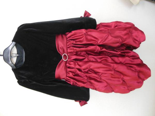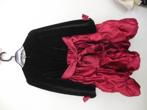 ■黒のベルベット風生地とワイン色のサテンのコンビドレスです。スカートの裾はバルーン型です。