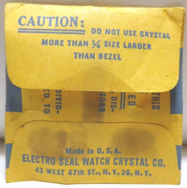 U.S.Aの時計パーツメーカー『ELECTRO SEAL WATCH CRYSTAL CO.』の風防です。アメリカの風防専門メーカーです。40年代の未使用。デッドストックです!パッケージに年代を感じます。アンティークで多い円形ドームの風防です。フラットタイプ風防の腕時計ではご使用できません。サイズは当方計測値で”28.0”(直径)サイズです。プラスチック製!風防リモーバーで簡単でつけ替える事ができます。時計に付いている風防と同じサイズならば簡単に交換できます(時計に風防が付いているサイズでは無くはずしたときのサイズと同じな事が必要です)。プラスチックですので大きめの場合はサイド部分をやすりで簡単に削る事が出来ます。ドーム形状の風防交換には最低でも鍵爪式の風防挿入器が必要となります!それなりの知識のある方向けです!中古品ですので、ノークレーム、ノーリターンでお願いします。