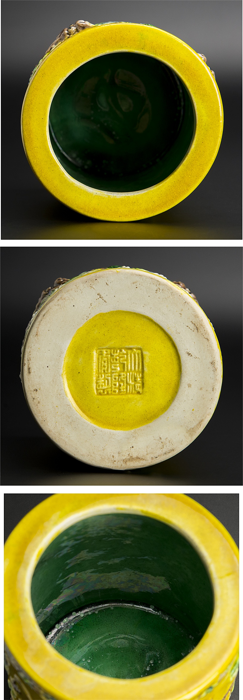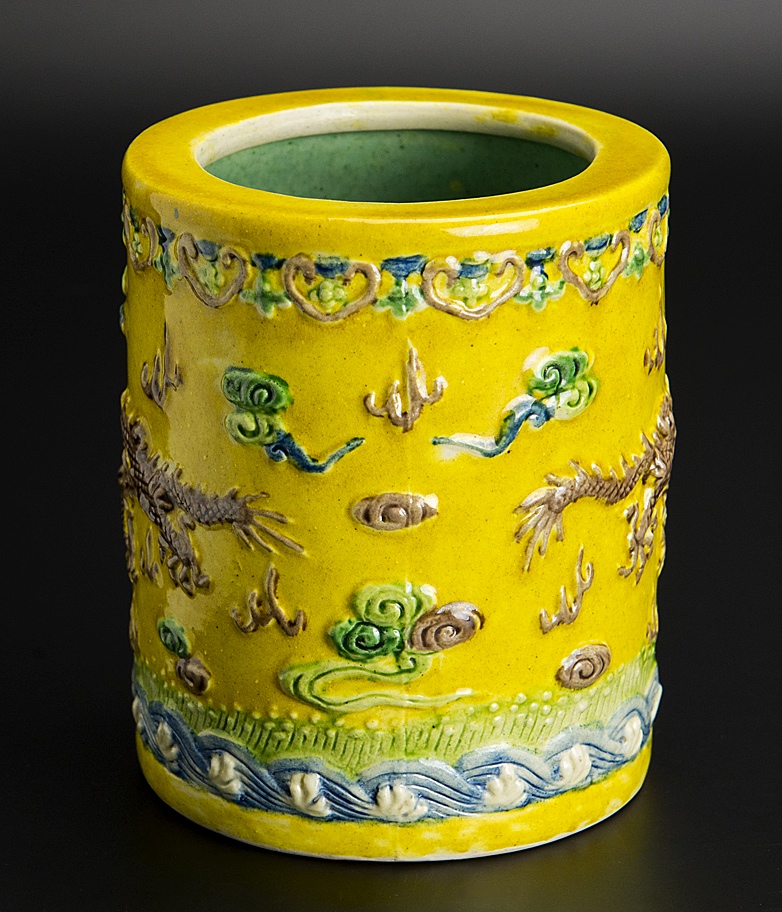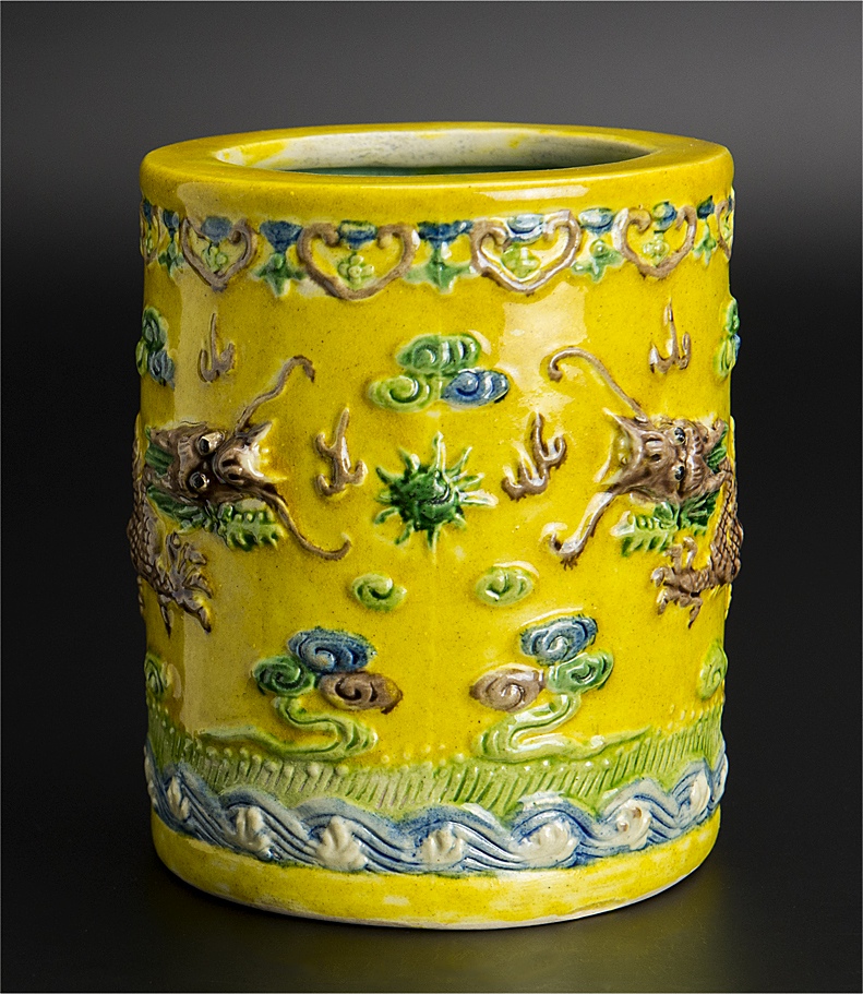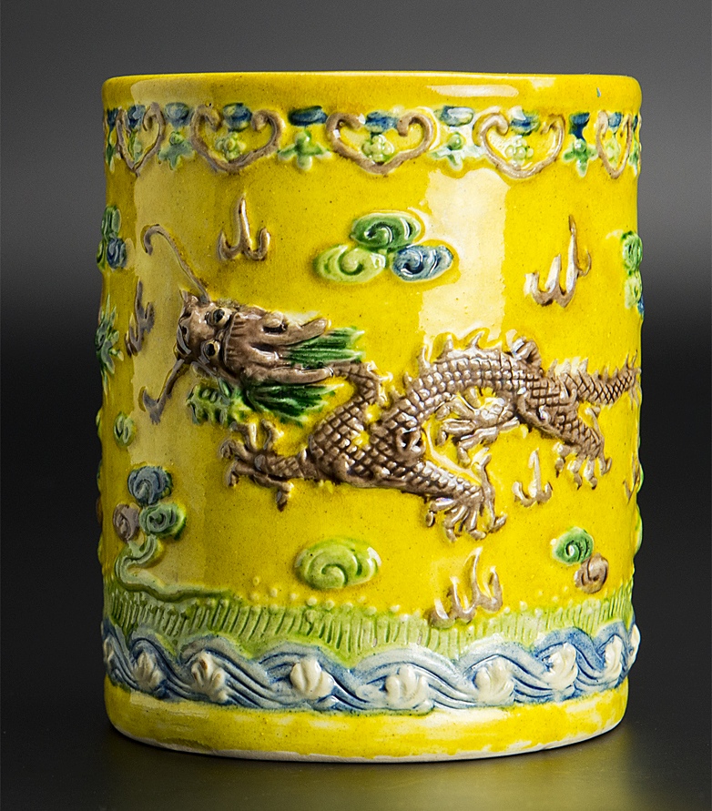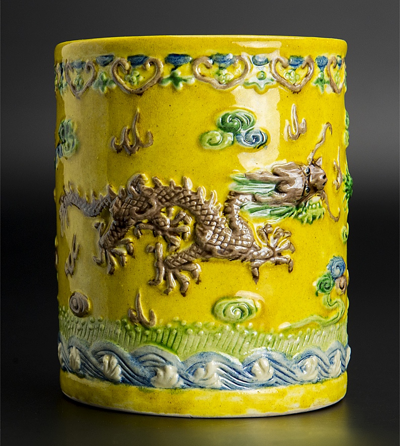 清 素三彩堆塑龍紋筆筒 乾隆年制款 中国 古美術