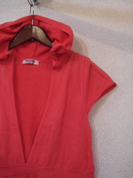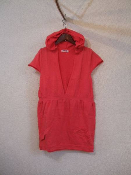 | 商品紹介 | フード付きの半袖チュニックです。 胸元は深いVネック、切替えから下は少しふんわりしていますが、ほぼ ストンとした形です。 色はオレンジが混ざったようなピンクで、薄手のトレーナー素材です。 《素材》 綿100% |