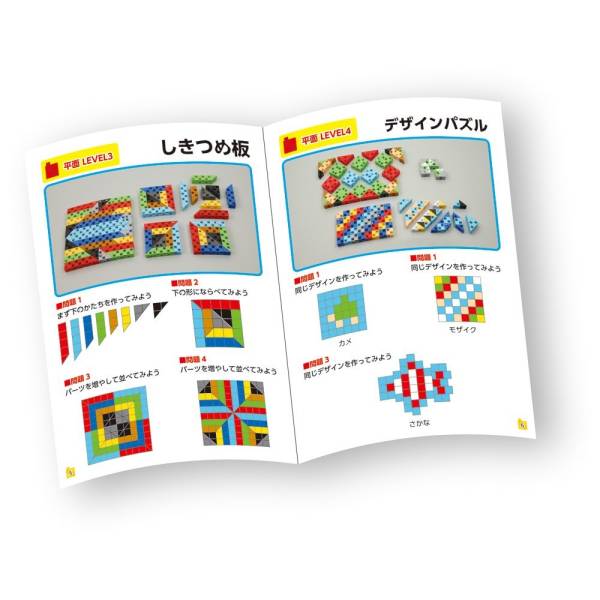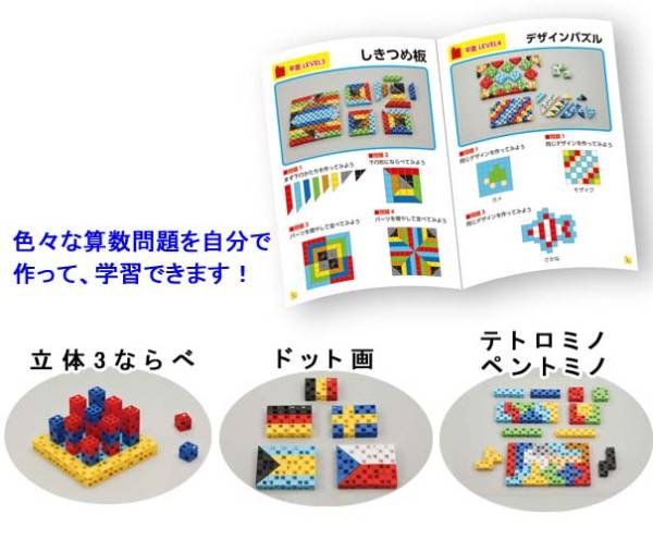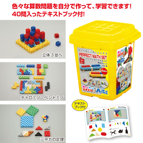 パーフェクトマスセットはタングラム、立体3ならべ、テトロミノ、ペントミノ、ドット画、デザインパズル等々・・・色々な算数問題にチャレンジできる算数のブロックセットです。40問入ったテキストブックもついています。算数のセットですが、対象は3才から。